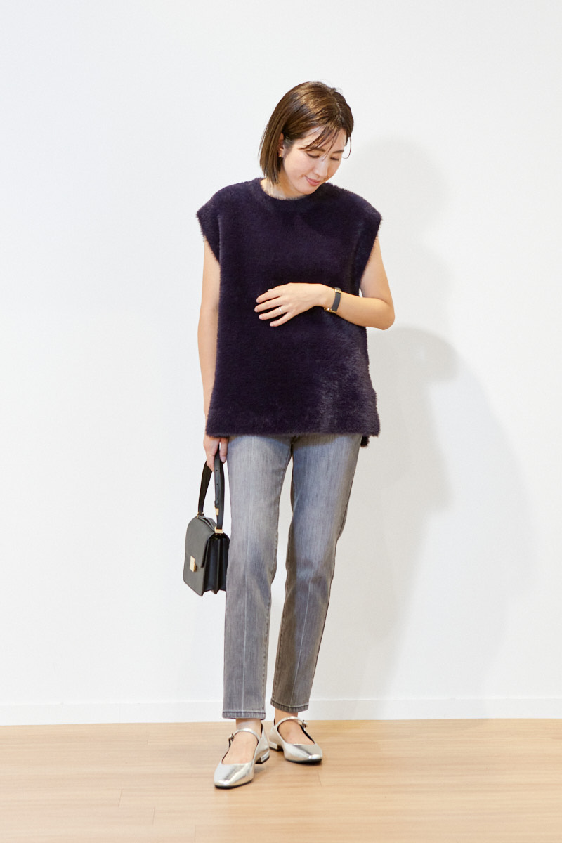 迷いに迷って選んだは「スティックジーンズ」の通常丈のグレーカラー。3型どれも美脚見えするのですが、産後からまだ1年ということもあり、より細く華奢見えする「スティックジーンズ」に惹かれました。産後ってどうしても体型カバーに走りがちなのですが、これは気になっていた太もものラインをうまく拾わずに脚を細く見せてくれるところに感動。お腹周りの圧迫感もないので産後自信をもってデニムデビューしたいママにはおすすめです!