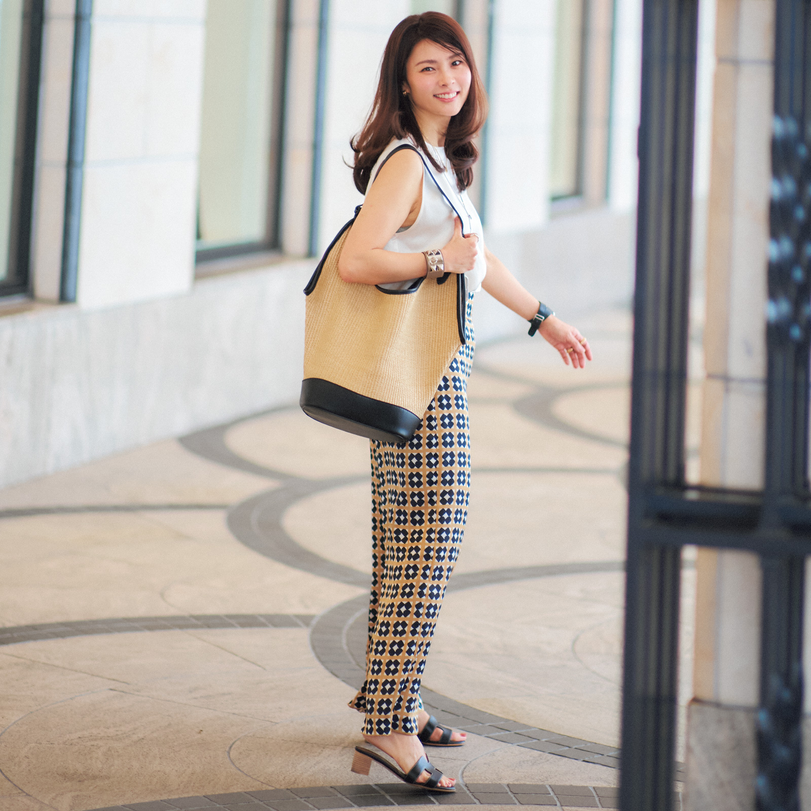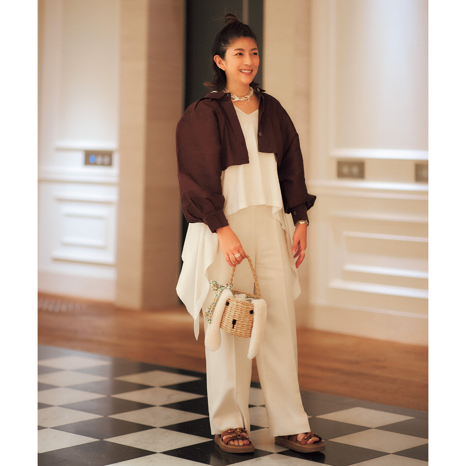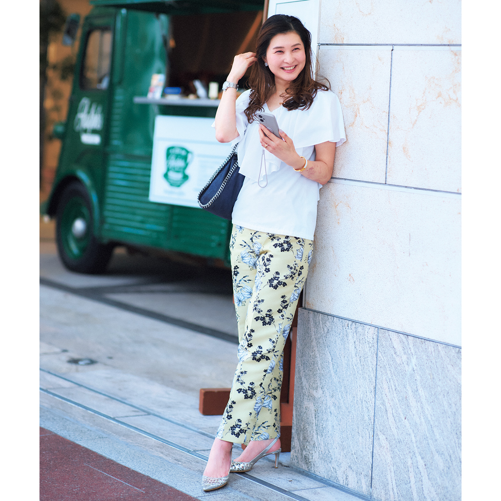 ママ友たちが美しくいつも刺激をもらっています。食べるもので肌は作られるから、サプリでなく毎日いただく食材から栄養補給を心がけています。パンツはセブンテン、サンダルはプラダのシルバーをポイントに。