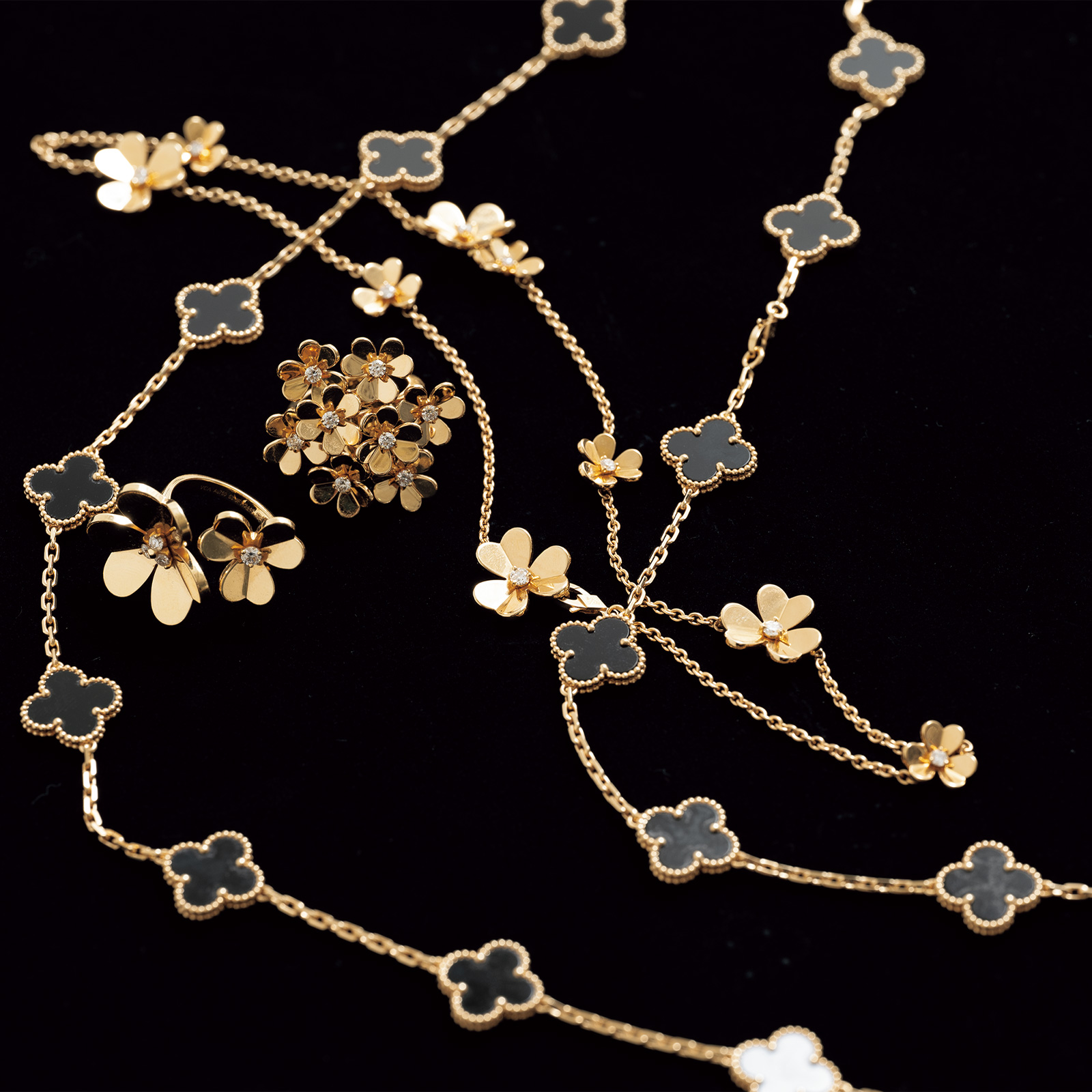 1.フリヴォルやアルハンブラなど定番の重ねづけで甘さの加減を。どんなスタイルにも存在感を発揮してくれるのが◎。身につける楽しさだけでなく、集める楽しさにも開眼。