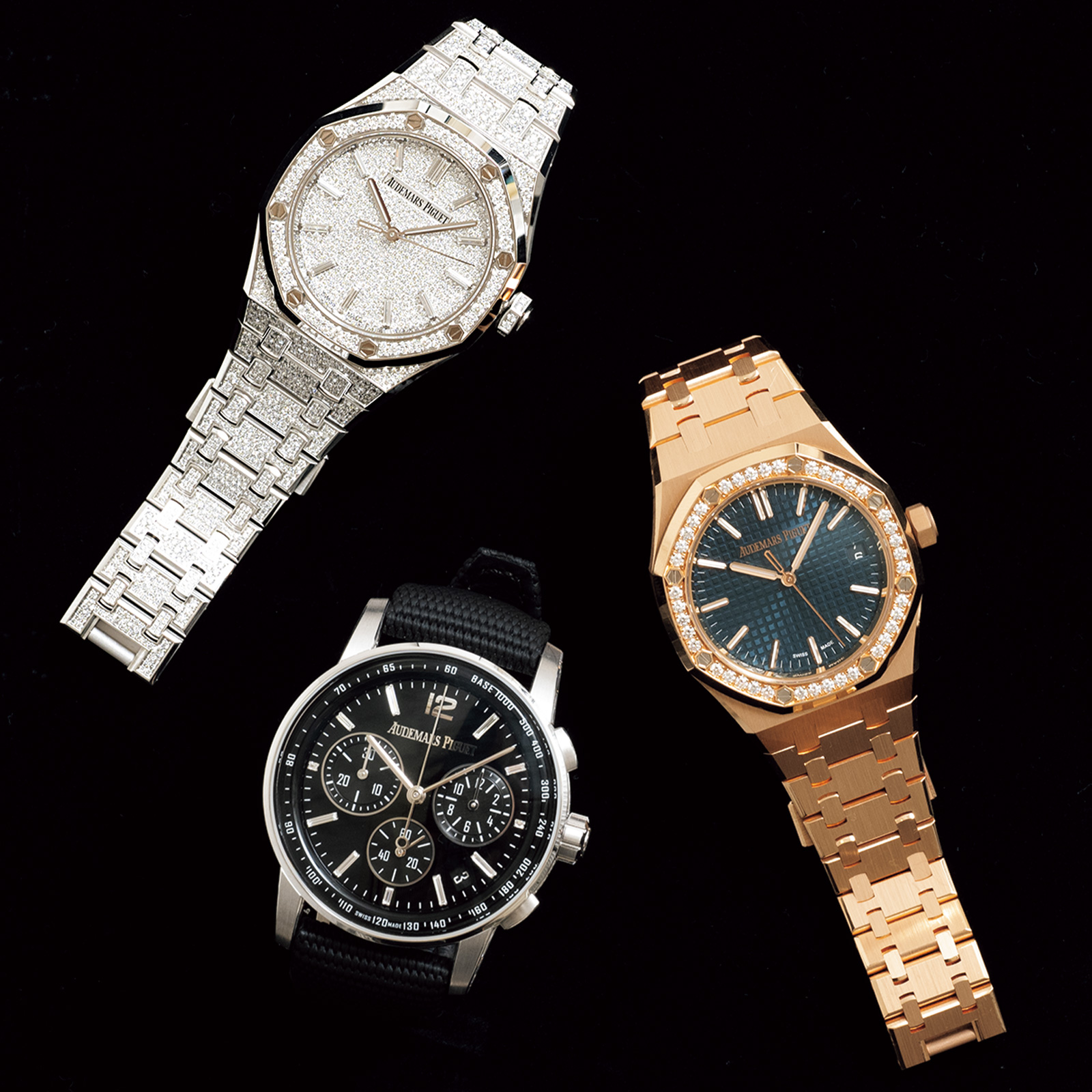2.オーデマ ピゲはロイヤルオーク37mmが1本目。時計が放つオーラに圧倒されて2本目も。オニキスがお守り代わりのCODE 11.59は41mm。ブレス代わりにサラッとつけたい。