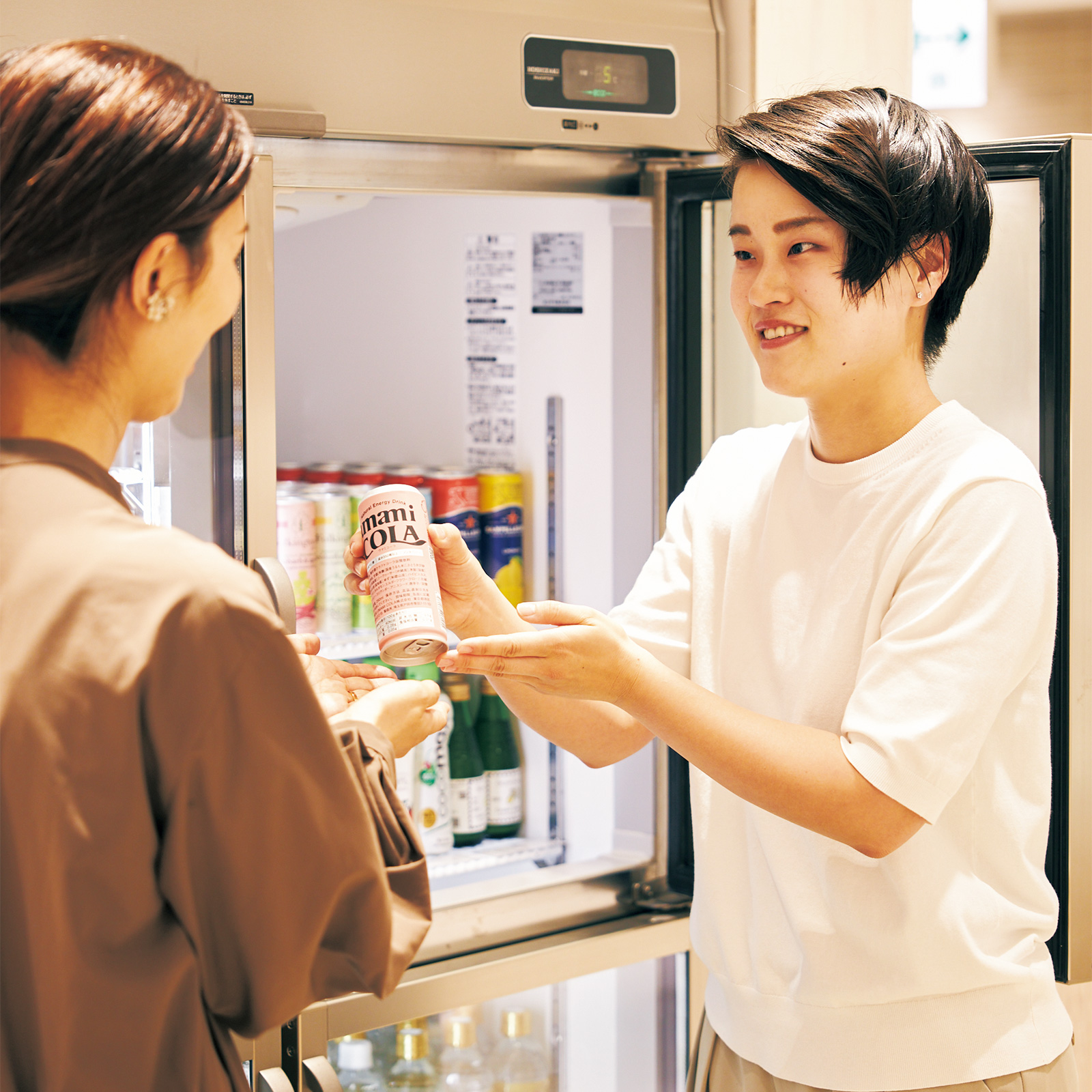店内の冷蔵庫にはその場で元気がチャージできる、インナーケアドリンクも充実。浜津さんオススメは自らも愛飲している、シーンや気分別で選べるエルボリステリアのショットドリンク「カンパイ」「オダヤカ」「プルプル」など。