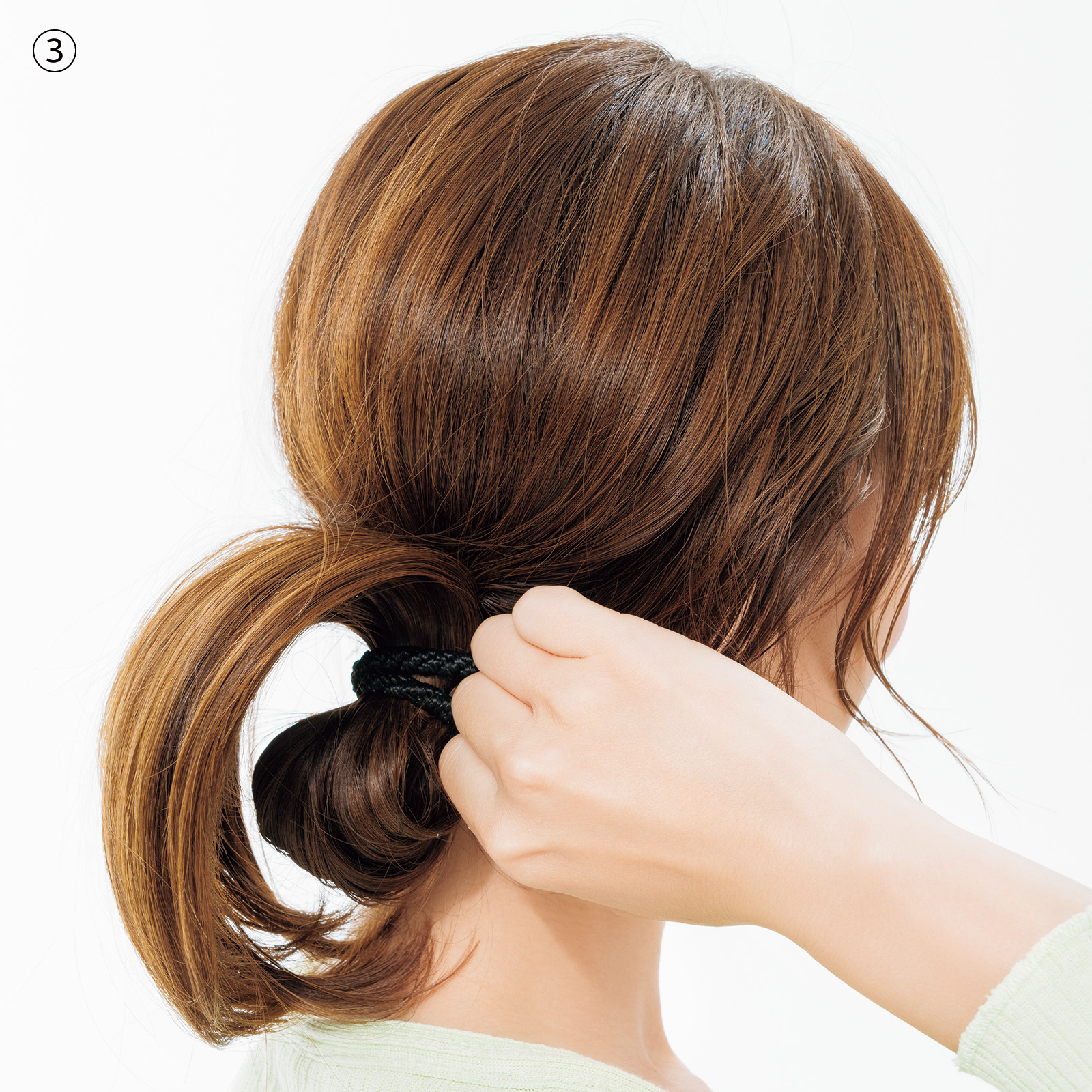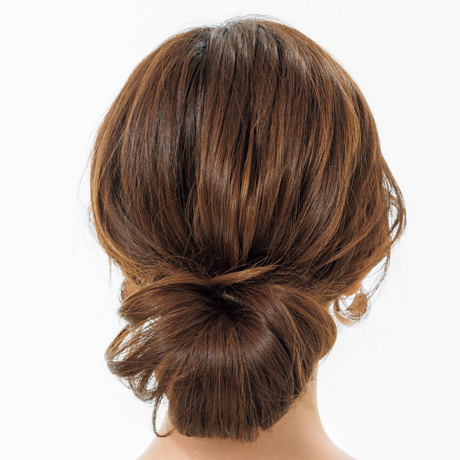 ③折り返した毛束をのお団子に重ね、2重のお団子のようにして、手に絡めておいたゴムで全てを結びます。ロングでも毛先がバサバサしない大人のシニヨンが完成。