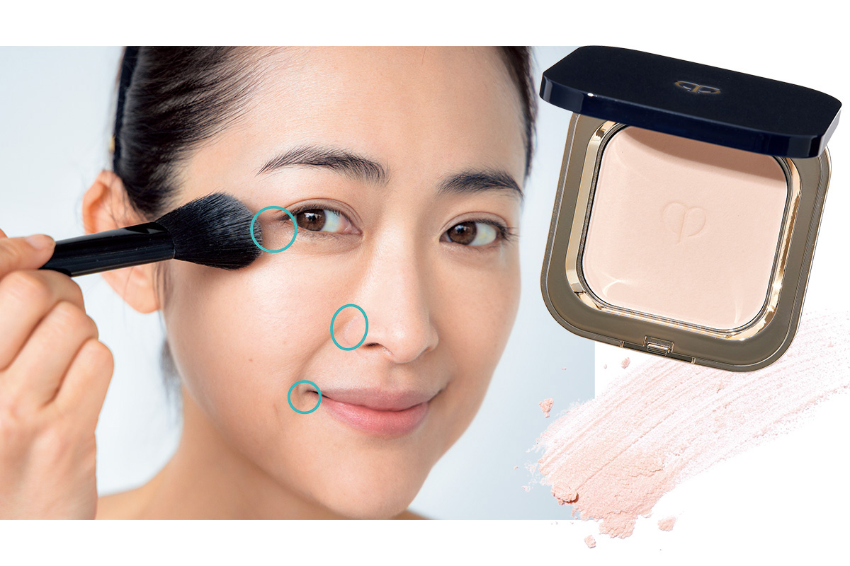 最初にパフに薄く取り、全体にすべらせてアラをカバー。次にブラシで眉上下、目尻、口角にくるくるのせてツヤ増しさせて。