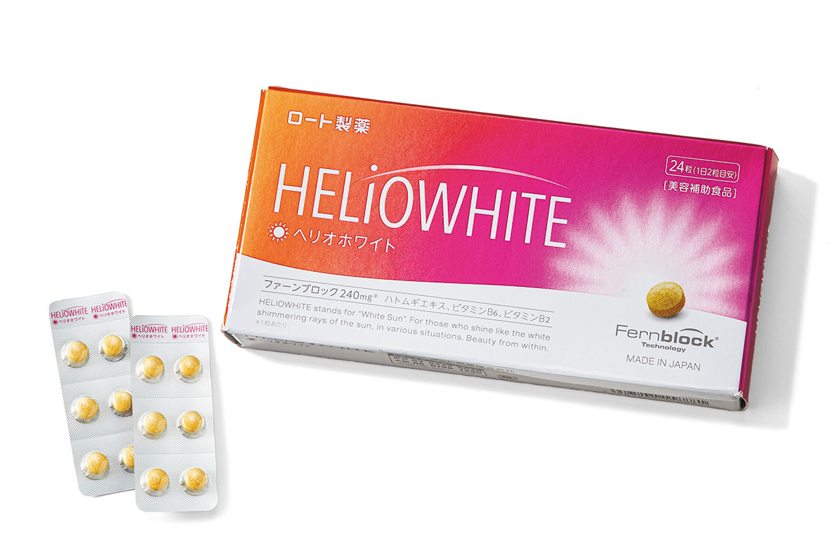 ファーンブロック240mgとハトムギやビタミン含有の美容補助食品。ヘリオホワイト24粒¥2,592(ロート製薬)