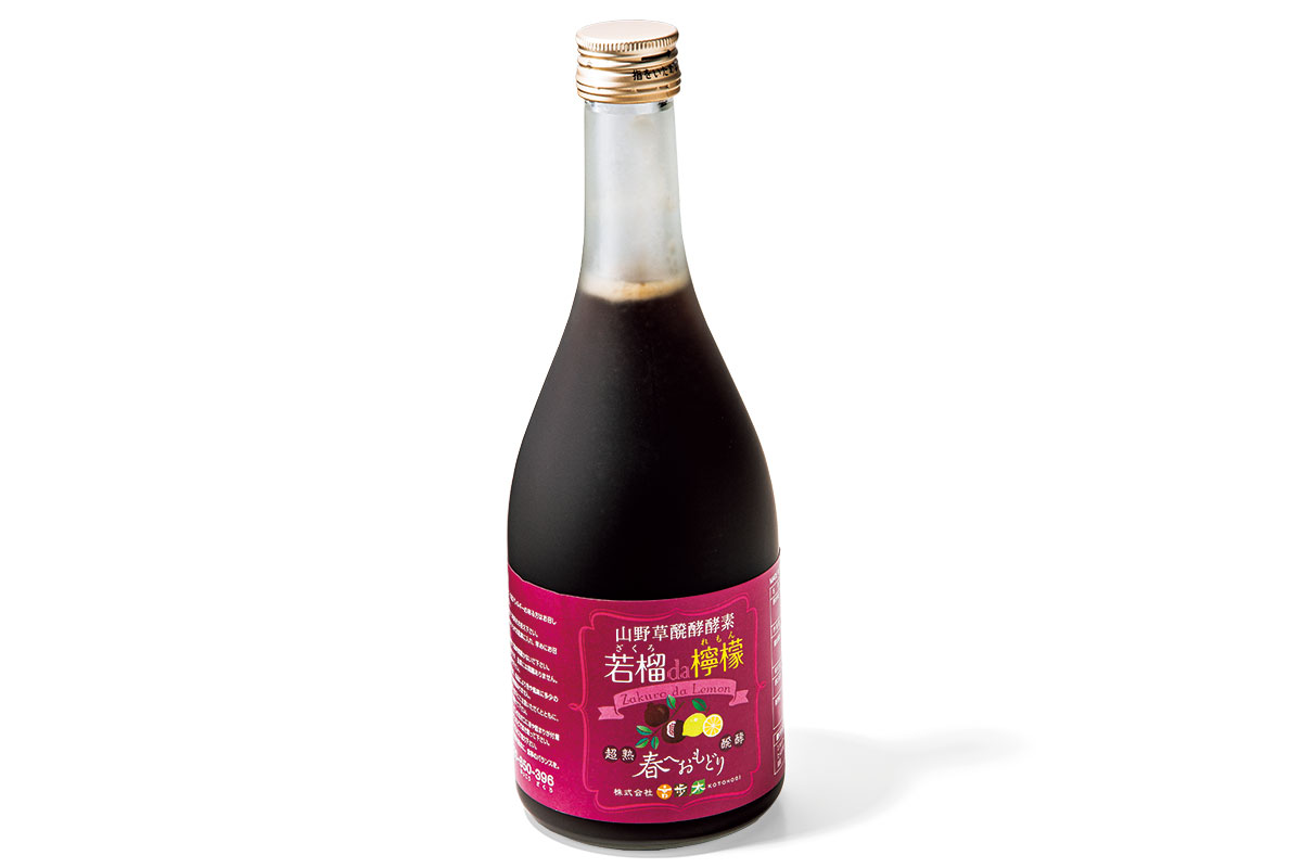 女性の果実と言われるザクロを丸ごと使用。さらに61種類の植物原材料を加えて、14カ月かけて発酵熟成させたドリンク。若榴da 檸檬 500ml ¥6,100 ※送料別途(言歩木)