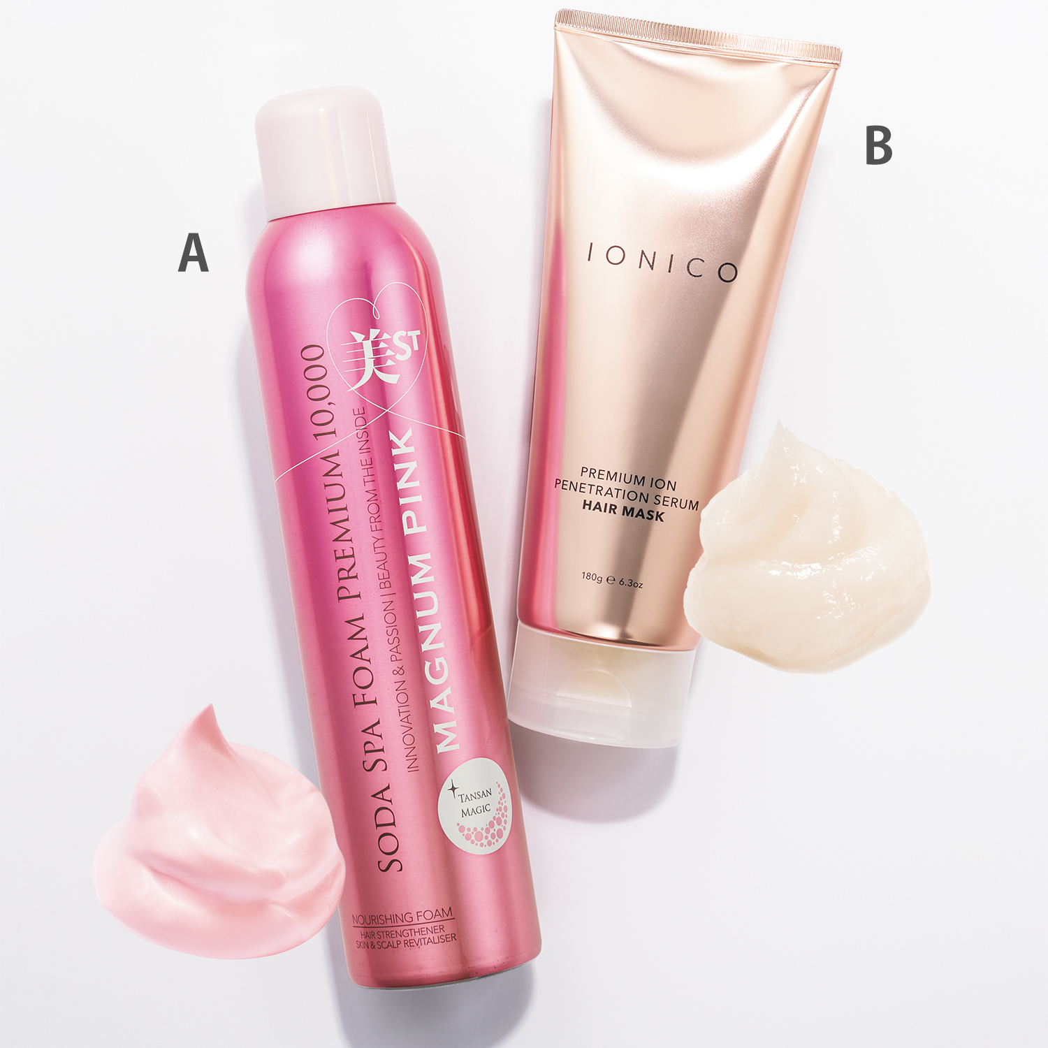 A:ビタミンB12配合でエイジングケア。ソーダスパフォームプレミアム10,000 マグナムピンク ※数量限定 200g ¥4,950(東洋炭酸研究所)B:塗布後10秒で傷んだ髪を補修。イオニコ プレミアムイオン 浸透美容液ヘアマスク 180g ¥1,540(ビジナル)