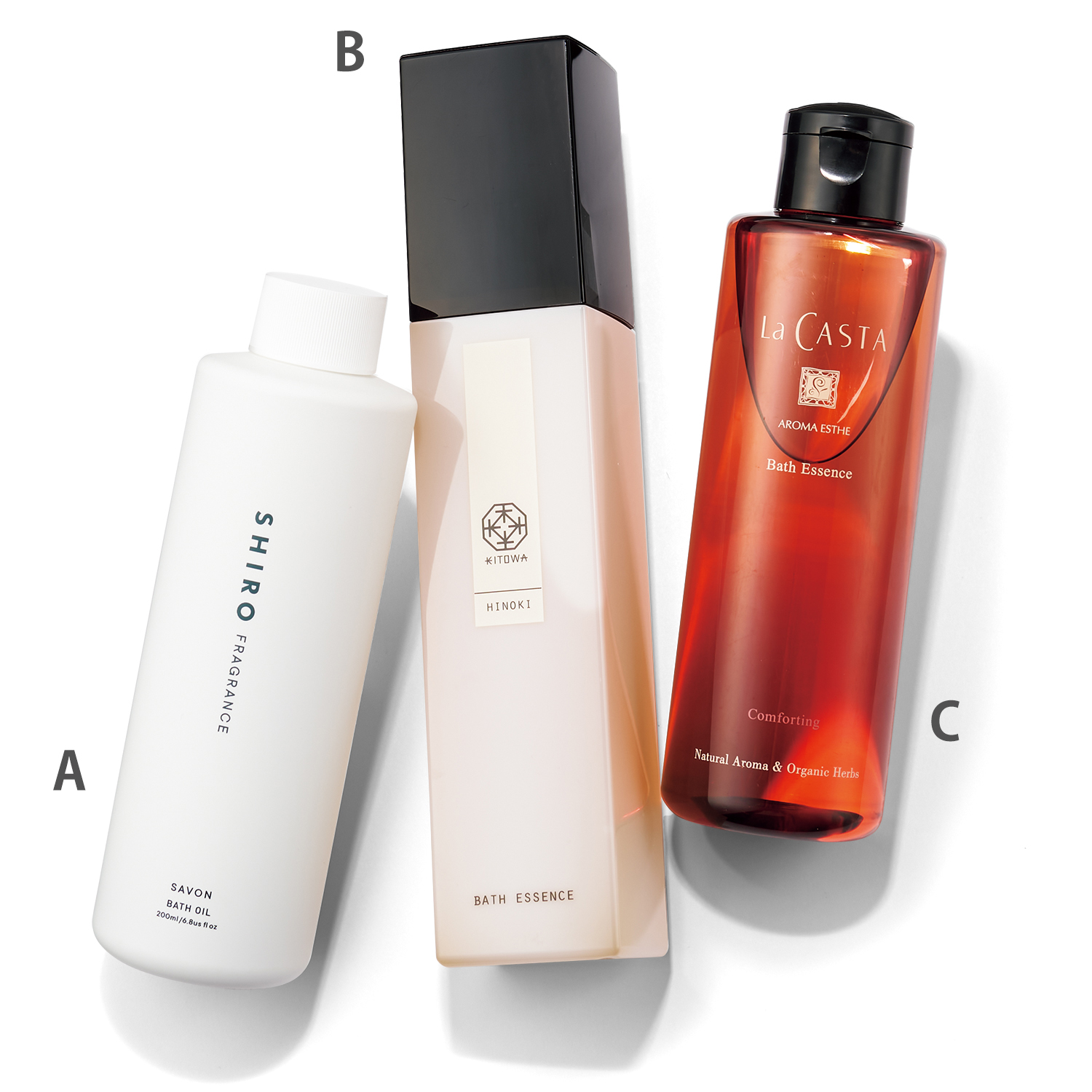 A入浴後も潤いのヴェールを長時間キープ。SHIRO サボン バスオイル 200ml ¥4,180(シロ)B:天然保湿オイル配合で優しい肌触り。KITOWA バスエッセンス ヒノキ 200ml ¥5,940(KITOWA)C:ハーブエキスが素肌をしっとり潤す。ラ・カスタ アロマエステ バスエッセンスCF 200ml ¥2,090(アルペンローゼ)