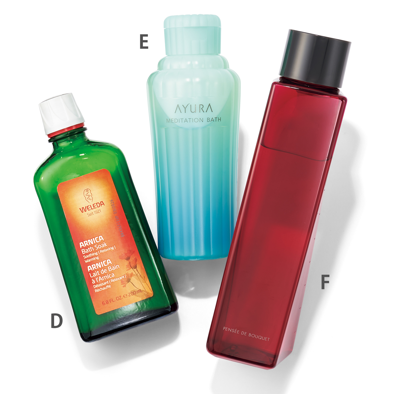 D:夏冷えの解消やコリをほぐす効果も。ヴェレダ アルニカ バスミルク 200ml ¥3,410(ヴェレダ・ジャパン)E:清涼感のある香りで肌と心を癒す。アユーラ メディテーションバス(香涼み)※数量限定 300ml ¥2,750(アユーラ)F:ハリ&透明感のある肌に。優雅なスイートフローラルの香り。ポーラ パンセ ド ブーケ バスエッセンス ルージュ 400ml ¥2,200(ポーラ)