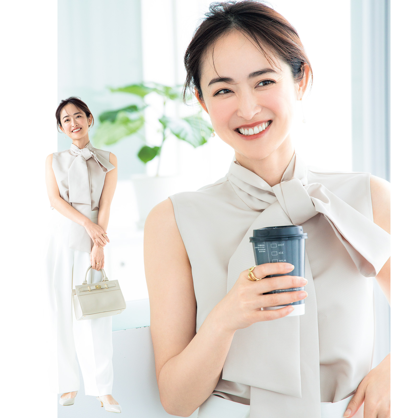 ボウタイブラウス¥15,400(ダブルスタンダードクロージング/フィルム)パンツ¥19,910(リネイヴ/オンワード樫山)バッグ¥22,550(ダイアナ/ダイアナ 銀座本店)パンプス¥47,300(ファビオ ルスコーニ/プライム ビアンカ)ピアス[片耳販売]各¥8,800〈スキャット〉バングル¥3,300リング[左手]¥3,080〈ともにヘンカ〉リング[右手]¥16,500〈PLAFU〉(すべてロードス)