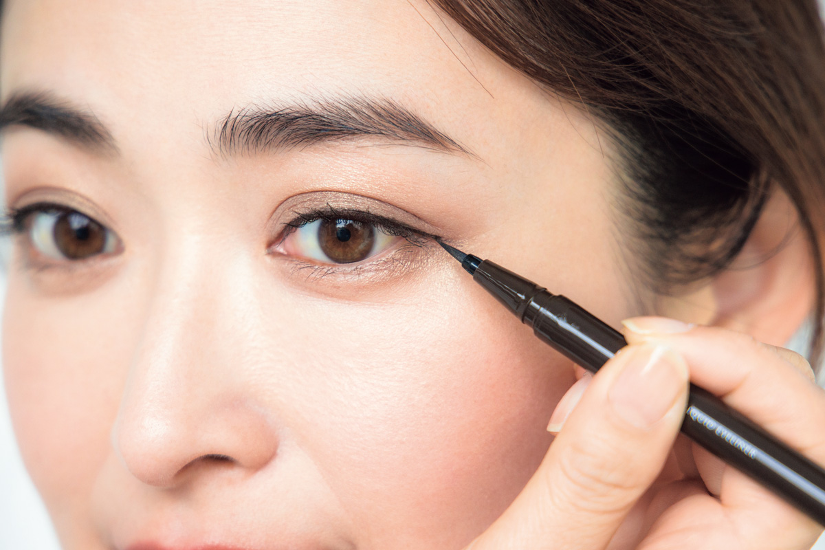 左から、素直な印象を引き出す、白桃のようなピーチピンクカラー。キヌケアグローアップ BG 936 ¥4,840(シュウウエムラ)ディオールスキン フォーエヴァー スキン パーフェクト スティック 1N ¥7,370(パルファン・クリスチャン・ディオール)茶色をMIXしたようなソフトな黒。ディーアップ シルキーリキッドアイライナー WP ブラウンブラック ¥1,430(ディー・アップ)優しい印象のブラウンラインが持続。SHISEIDO マイクロライナーインク 02 ¥3,850 (SHISEIDO)
