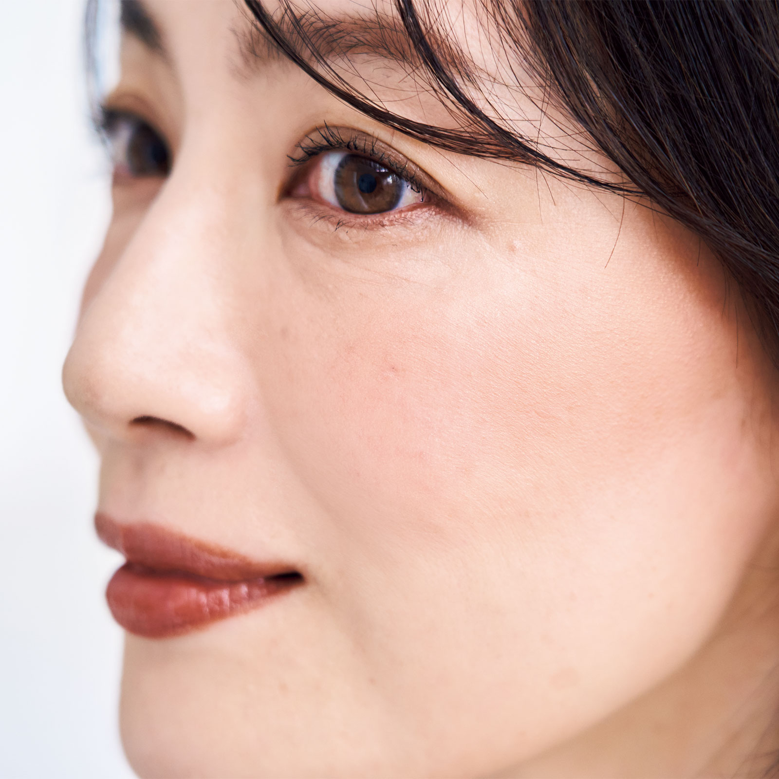ブラウンリップを主役にしたメイクの場合、アイメイクは引き算するのが正解。リップと同じトーンのブラウンシャドウをアイホールに薄くのせ、奥行きを出す程度にとどめること。