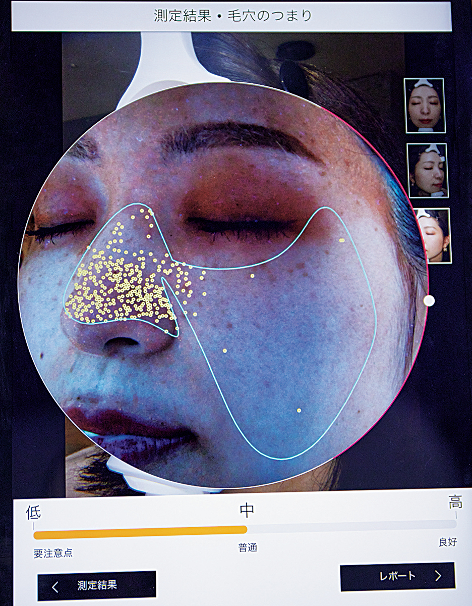 今の毛穴のつまりが黄色の点で可視化。肉眼ではわからない箇所も明らかになり、お手入れのモチベーションも上がる筧さん。定期的に肌分析を受けると意識が高まり状態が改善される人が多いという。