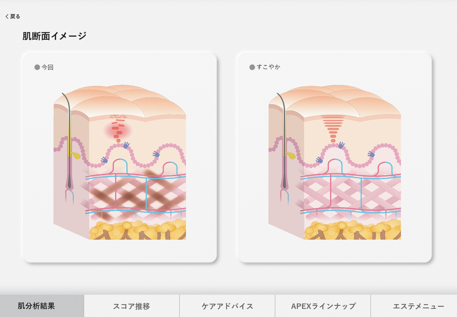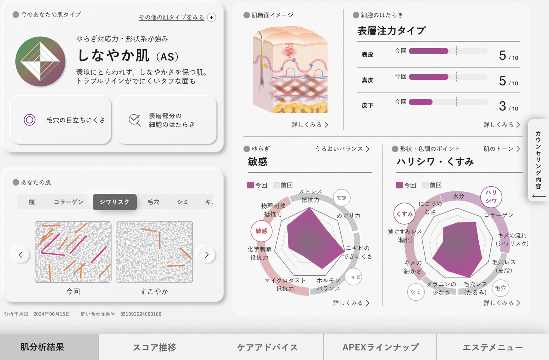肌三層の状態を細胞レベルで推測。将来のリスクもスコア化。APEX(アペックス)のアイテムは688万通りからプランニング。