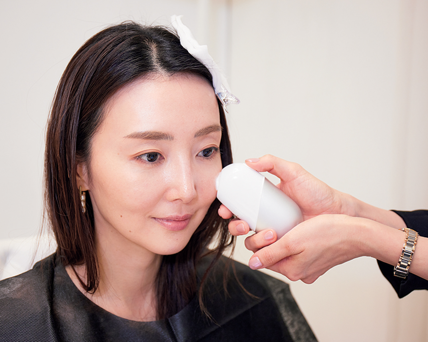 敏感に傾きがちな月島さんの肌には、手のぬくもりをいかしたお手入れを。包み込むようにそっと触り、肌への浸透を高めます。