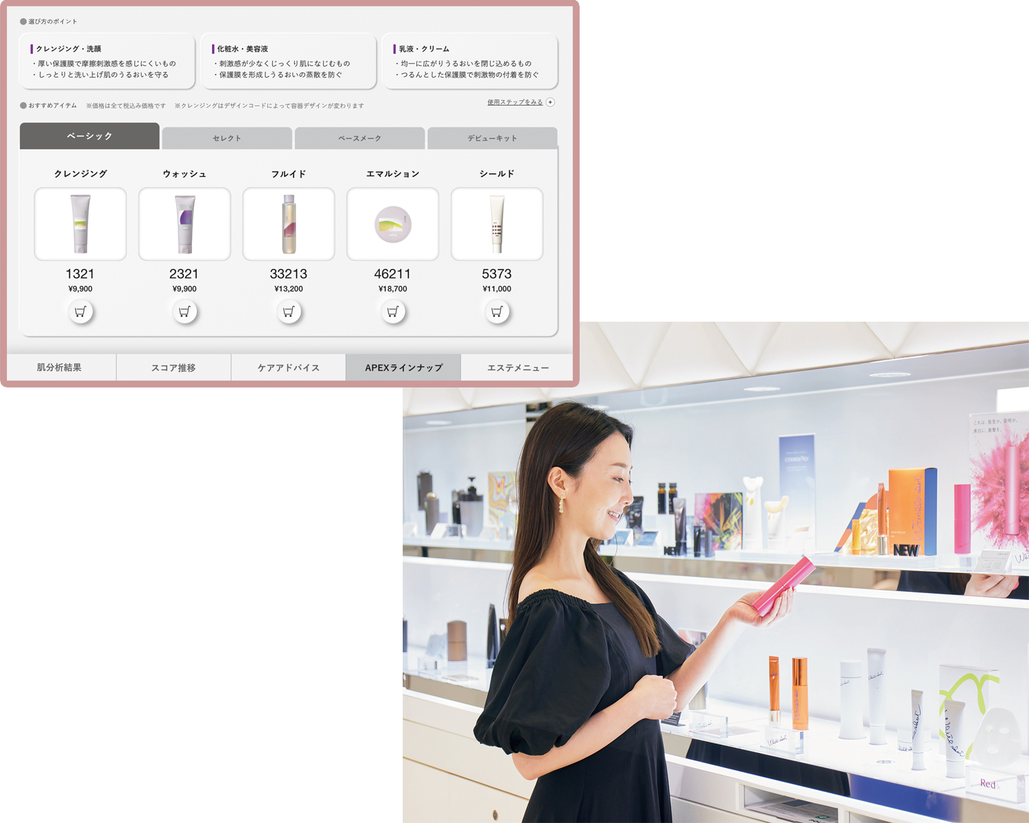 APEXのアイテムはクレンジングからベースメイクまで、全部で688万通りの組合わせの中からセレクト。月島さんには「アペックス クレンジングクリーム 120g¥9,900 /写真左」「同 フルイド 120ml ¥13,200/写真中央」といった、バリア機能の高い商品がオススメされた。店頭でオーダー後、数日で工場から直送される。