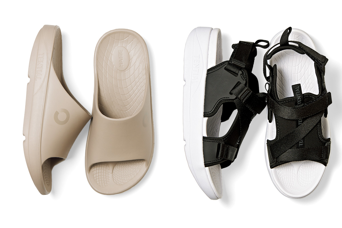 (左)家履きとしても人気。リカバリーサンダル Slide ベージュ¥7,920、(右)ワンピースにも相性◎。リカバリーサンダル Strap ブラック×ホワイト¥11,880(ともにTENTIAL)