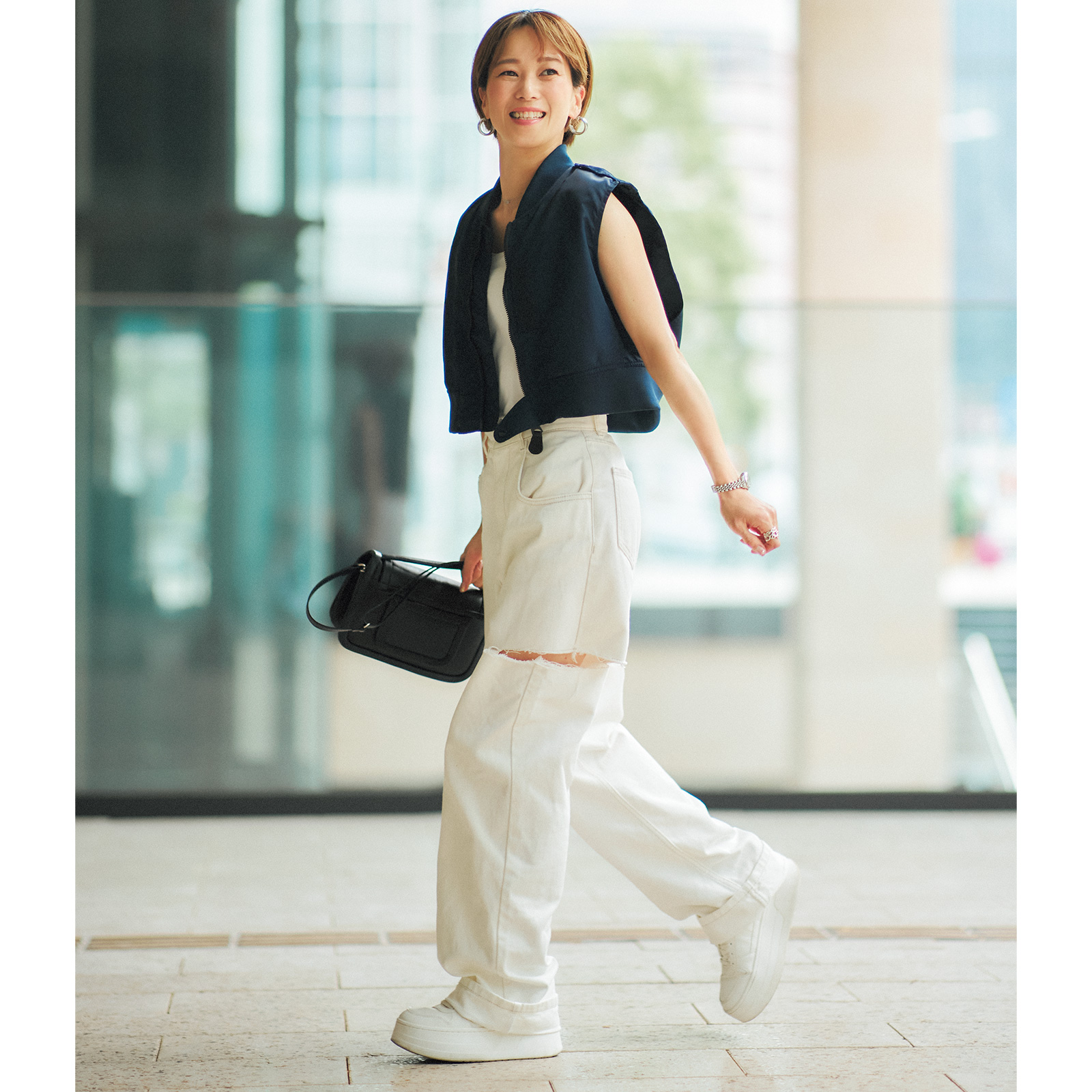 若さの秘訣はチャレンジあるのみ。ハーレーダビッドソンに乗れる大型免許もモーターショーの仕事をきっかけに40歳を過ぎて取得しました。上品めのカジュアルコーデが主流です。