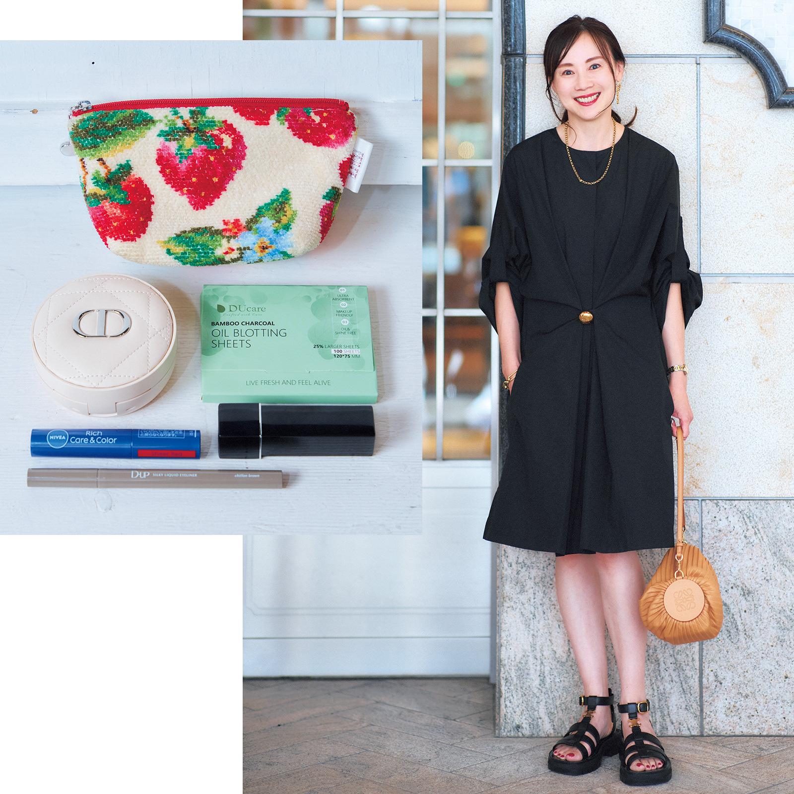出先でのメイク直しは、DUcareで皮脂を抑え、ディオールスキンフォーエヴァークッションパウダーで。ニベアリッチケア&カラーリップとカネボウルージュスターV09は手軽で保湿もでき発色も◎。
