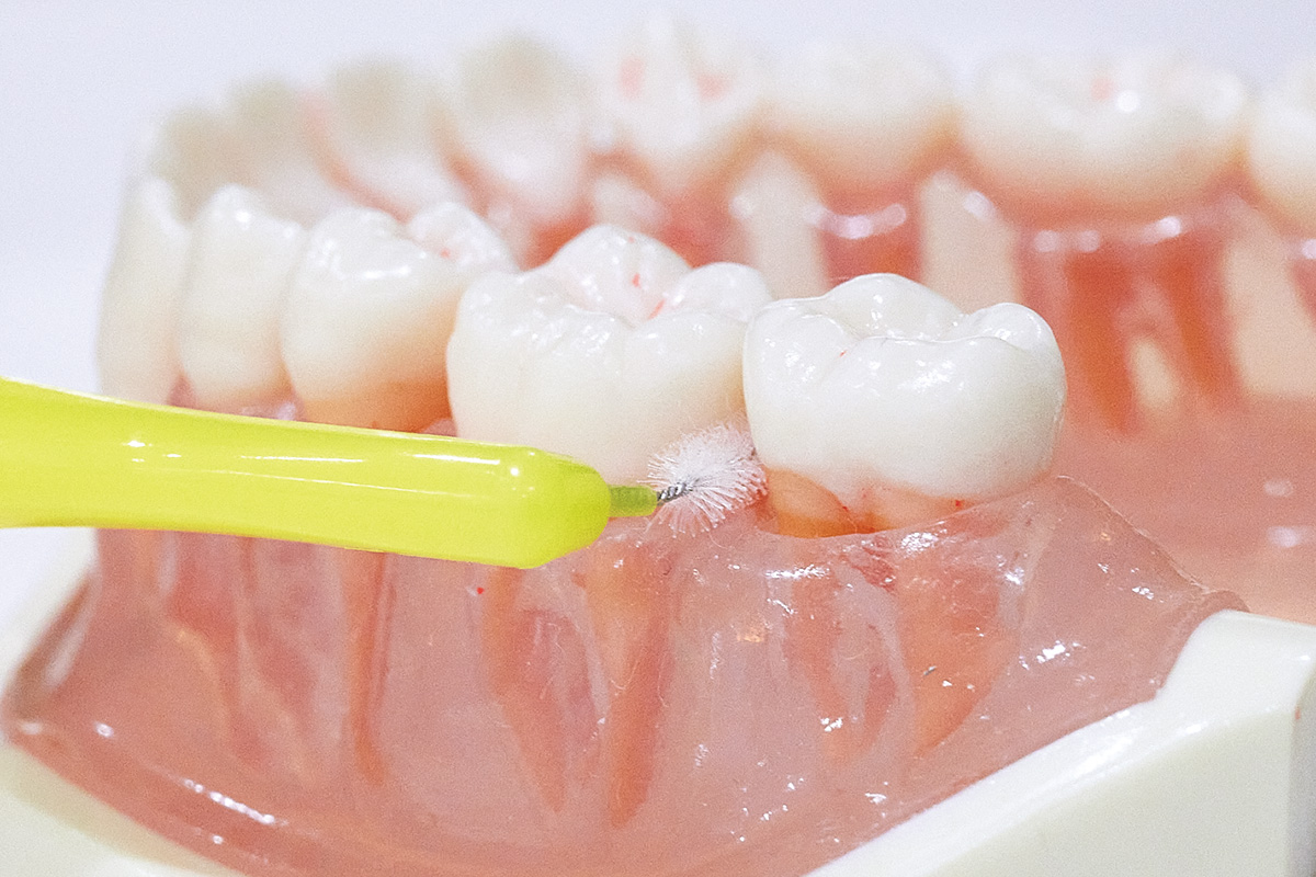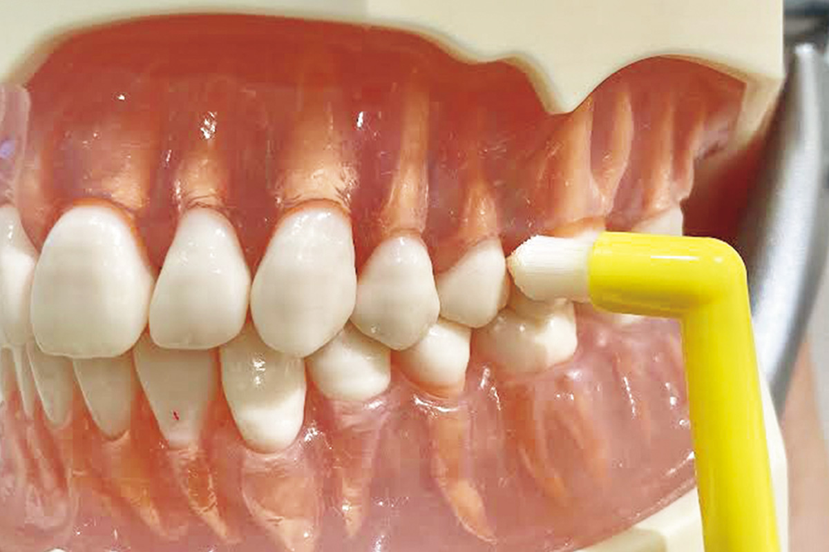 歯ブラシでは届かない奥歯の歯間や付け根ケアには歯間ブラシを。歯間の汚れを取るだけではなく、歯茎にしっかり当てて10往復すると歯茎のマッサージ効果もあり歯肉炎の予防にも。