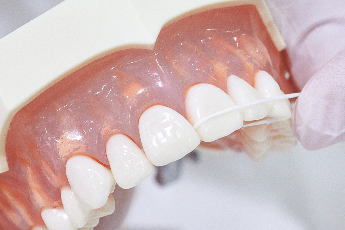 奥歯よりも歯間が狭い前歯の間は歯間ブラシやデンタルフロスの使用がオススメ。接している左右の歯、双方の側面の汚れをこそげ取るためにフロスの方向を左、右と変えて動かして。