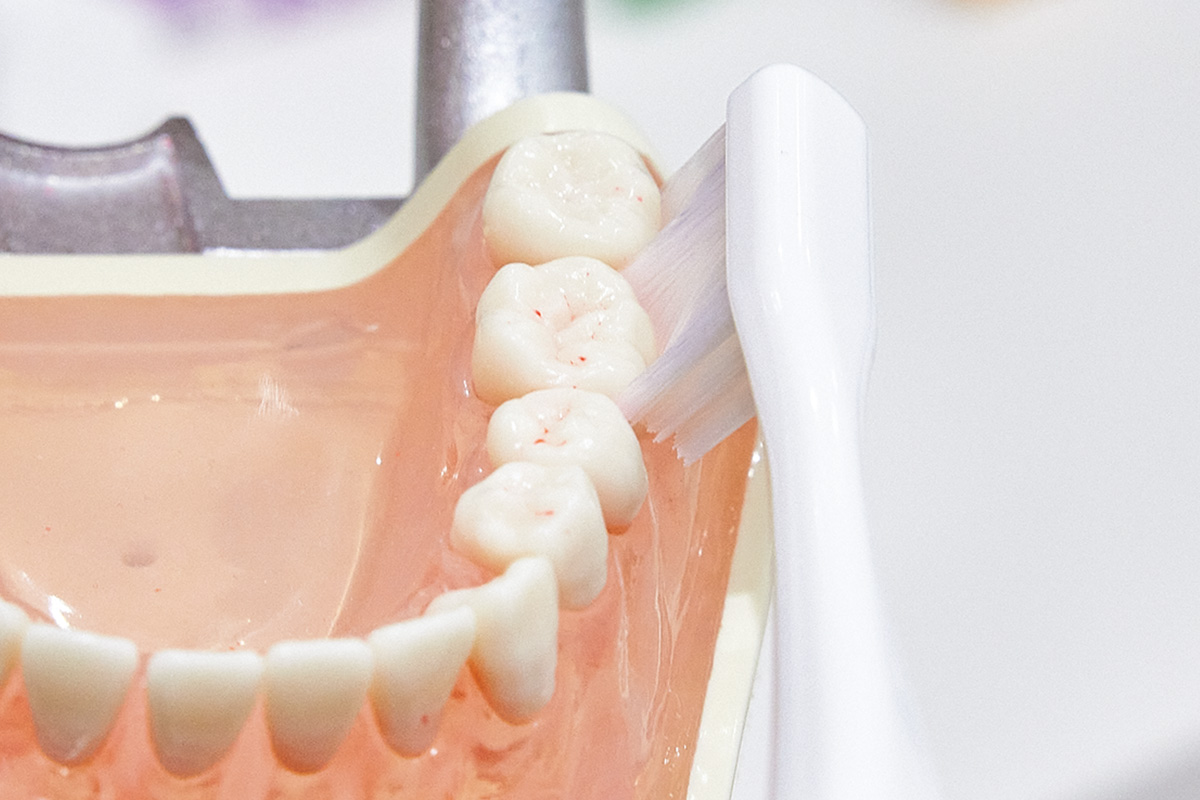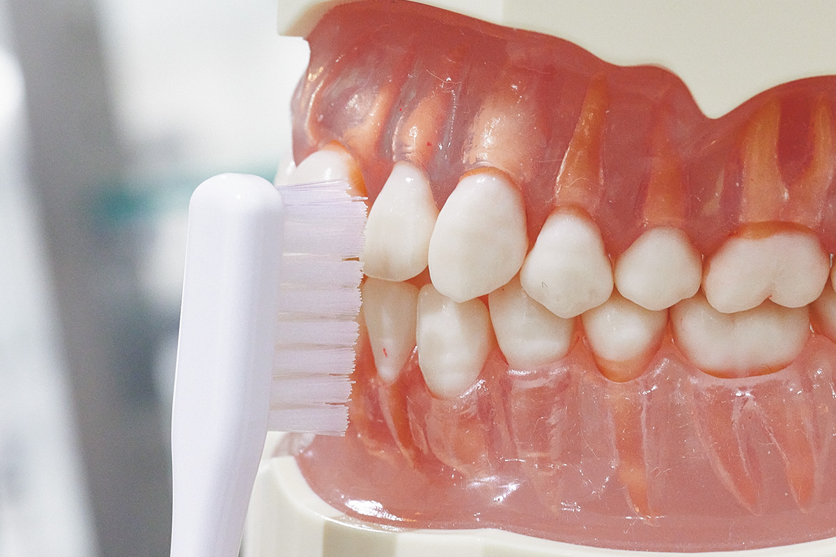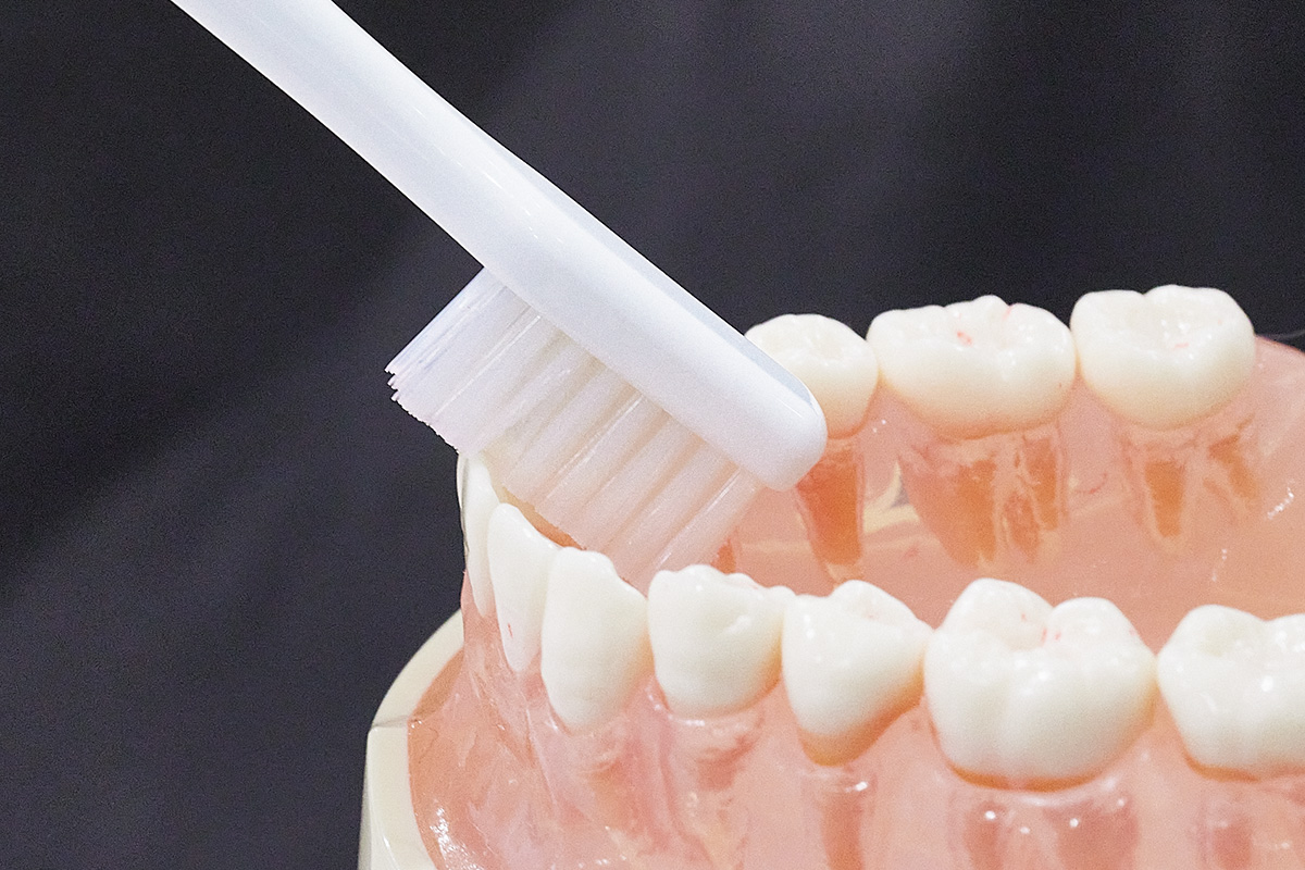 硬すぎないフラットな形状の歯ブラシを歯茎に向かって斜め45度に当てて。優しい力で小刻みに動かして歯の表面の汚れを除去し、同時に歯周ポケットの汚れを掻き出します。