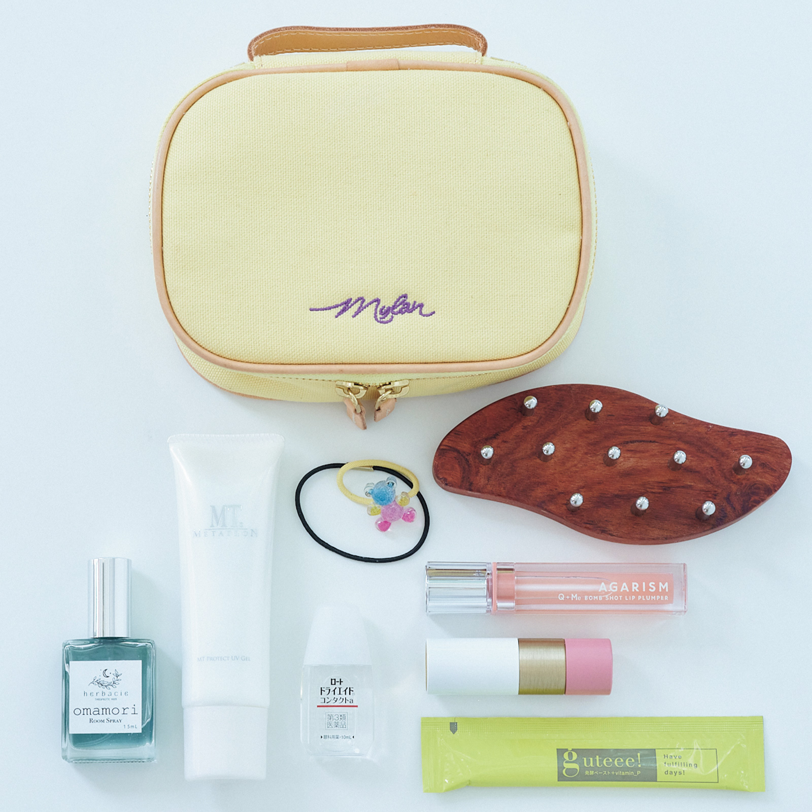 自分で開発したかっさは家はもちろん、移動中も使うほど欠かせないアイテム。眼精疲労があるので目薬、腸活のために飲んでいる酵素、日焼け止め、緊張をほぐしてくれる植物性のミストスプレー“omamori”で、自分の機嫌を整えます。娘用のゴムも必需品です。