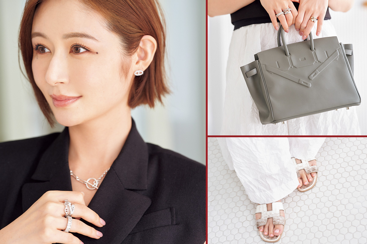 薬指のリングは婚約指輪、中指は夫がデザインしてくれたものとエルメスのシェーヌ・ダンクルを重ねづけ。そのほかの小物もすべてエルメス。サンダルはドバイで偶然出合った特注のもの。ヒマラヤのオランで、革がクロコのグラデになっていて、既製品にはないもの。バッグはバーキンシャドウ。その遊び心に心摑まれました。