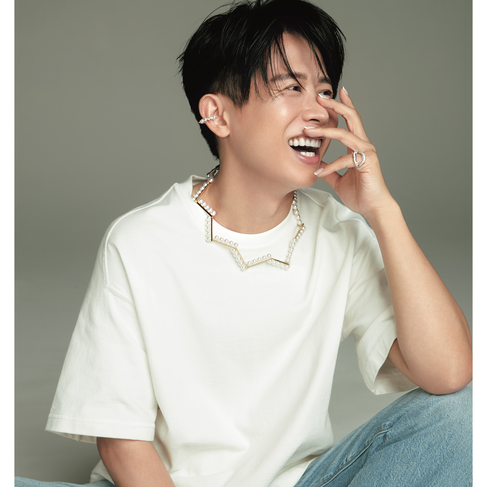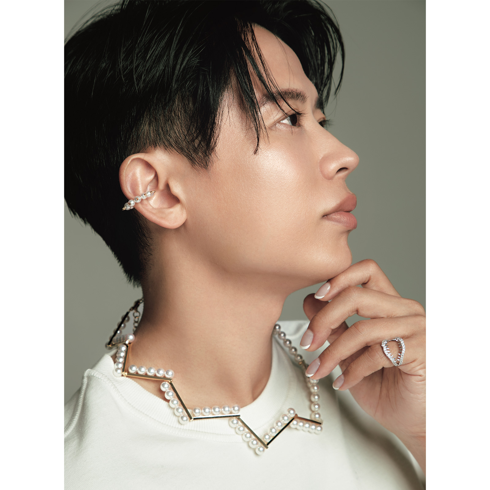 Tシャツ¥59,000(ボッテガ・ヴェネタ/ボッテガ・ヴェネタ・ジャパン)イヤカフ[右]¥295,900 ネックレス¥9,900,000リング¥1,068,000(すべてTASAKI)デニムパンツはスタイリスト私物