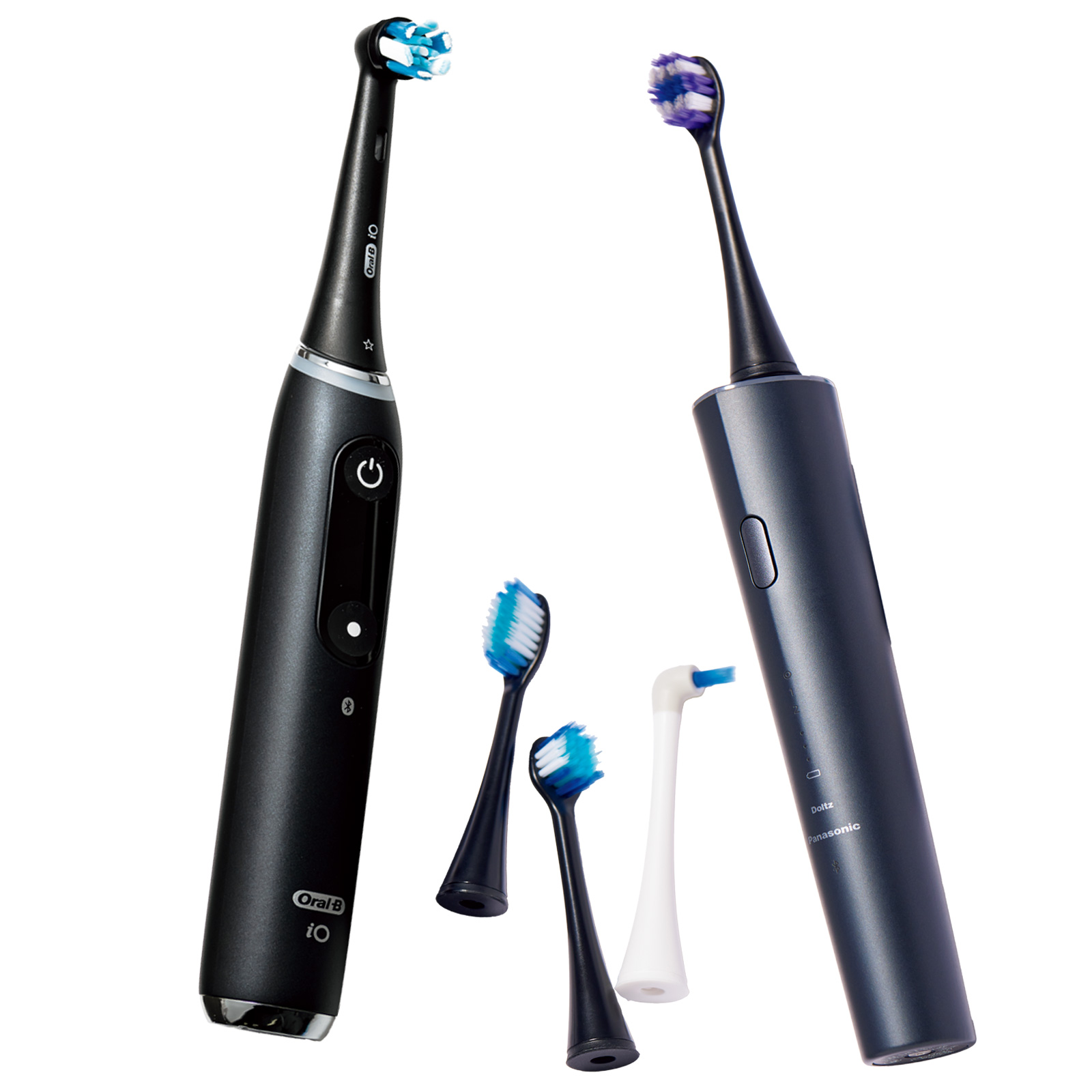 左から:丸型回転ブラシと毛の一本一本まで振動させる技術でブランド史上最高の歯垢除去力。ブラウン 電動歯ブラシ Oral-B i09 ¥43,780〈編集部調べ〉(P&G)、Bluetooth搭載で磨き方サポート。音波電動ハブラシ ドルツ EW-DT73 ¥45,540〈編集部調べ〉(パナソニック)
