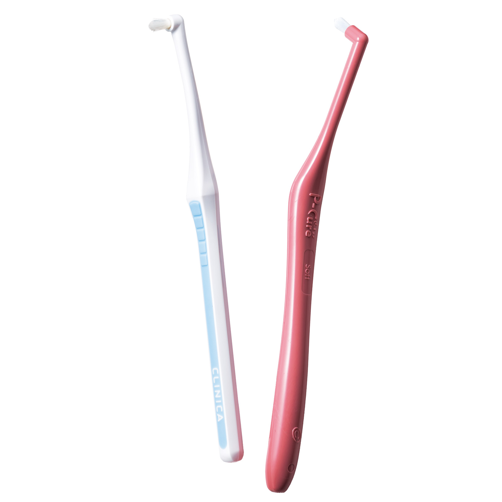 左から:極小ヘッドとロング先細毛が奥まで届く。クリニカアドバンテージ デンタルタフト¥330〈編集部調べ〉(ライオン)、優しい毛あたりで炎症のある部分もいたわりながらケア。Pキュア〈ソフト〉¥319(オーラルケア)