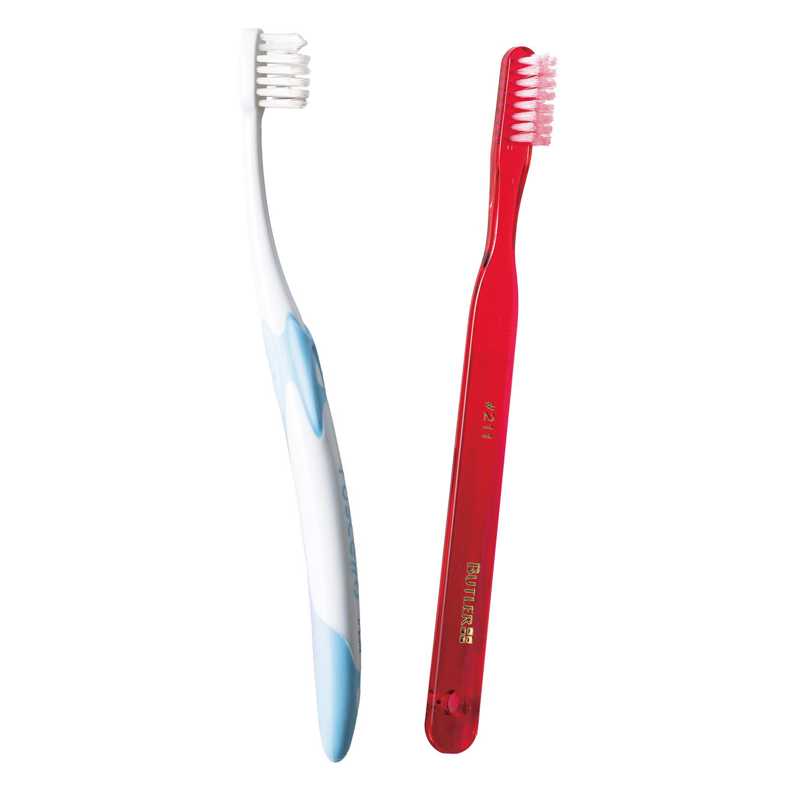 左から:どんな歯並びにもフィット。ルシェロ歯ブラシ B-20 ピセラS〈やわらかめ〉¥340[歯科専売品](ジーシー)、フラットな毛先が歯周ポケットに入って掻き出す。バトラー歯ブラシ#211(ミディアム)¥330(サンスター)