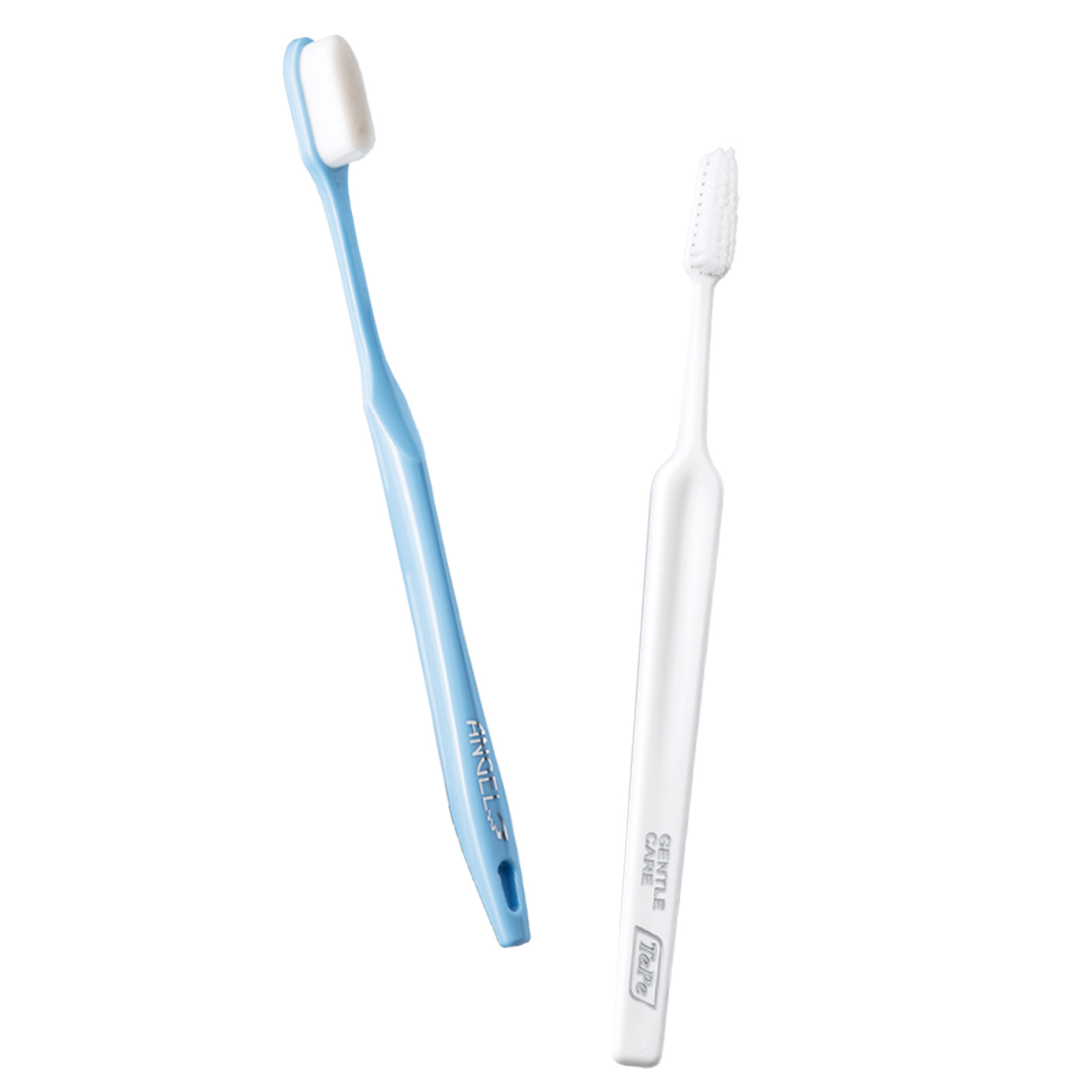 左から:密集毛束が弱った歯茎をいたわりながらケア。エンジェルマイクロブラシ ¥858(ユーカンパニー)、スウェーデン発、穏やかな歯あたりで知覚過敏でも安心な仕様。TePe ジェントルケア¥649〈編集部調べ〉(クロスフィールド)