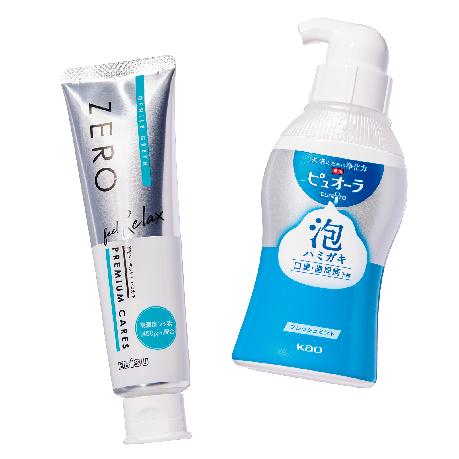 左から:濃密でキメ細かな泡がステインを浮かせて落とす薬用トータルケアハミガキ。ゼロプレミアムケアズ リラックス 90g ¥877[医薬部外品]〈編集部調べ〉(エビス)、ふんわり泡が舌に密着。口の隅々まで殺菌、口臭や歯周病を予防。薬用ピュオーラ泡ハミガキフレッシュミントの香味。190ml ¥1,375[医薬部外品]〈編集部調べ〉(花王)