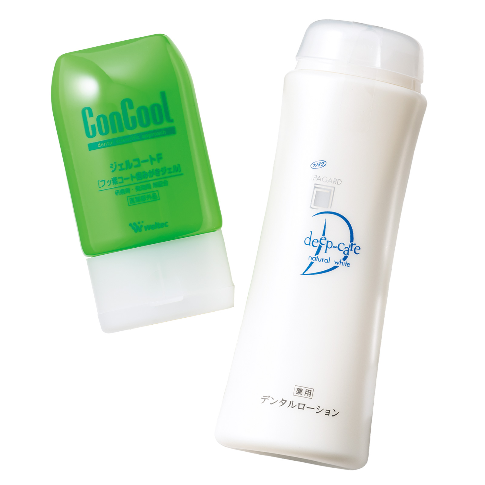 左から:隙間へ入り込んで薬効成分を届けるフッ素コートジェル。ジェルコート F[医薬部外品]90g ¥1,100(ウエルテック)、薬用ハイドロキシアパタイト配合のデンタルローション。歯の表面を修復し白い歯に。アパガードディープケア[医薬部外品] 250ml ¥1,980〈薬用液体歯磨き〉(サンギ)