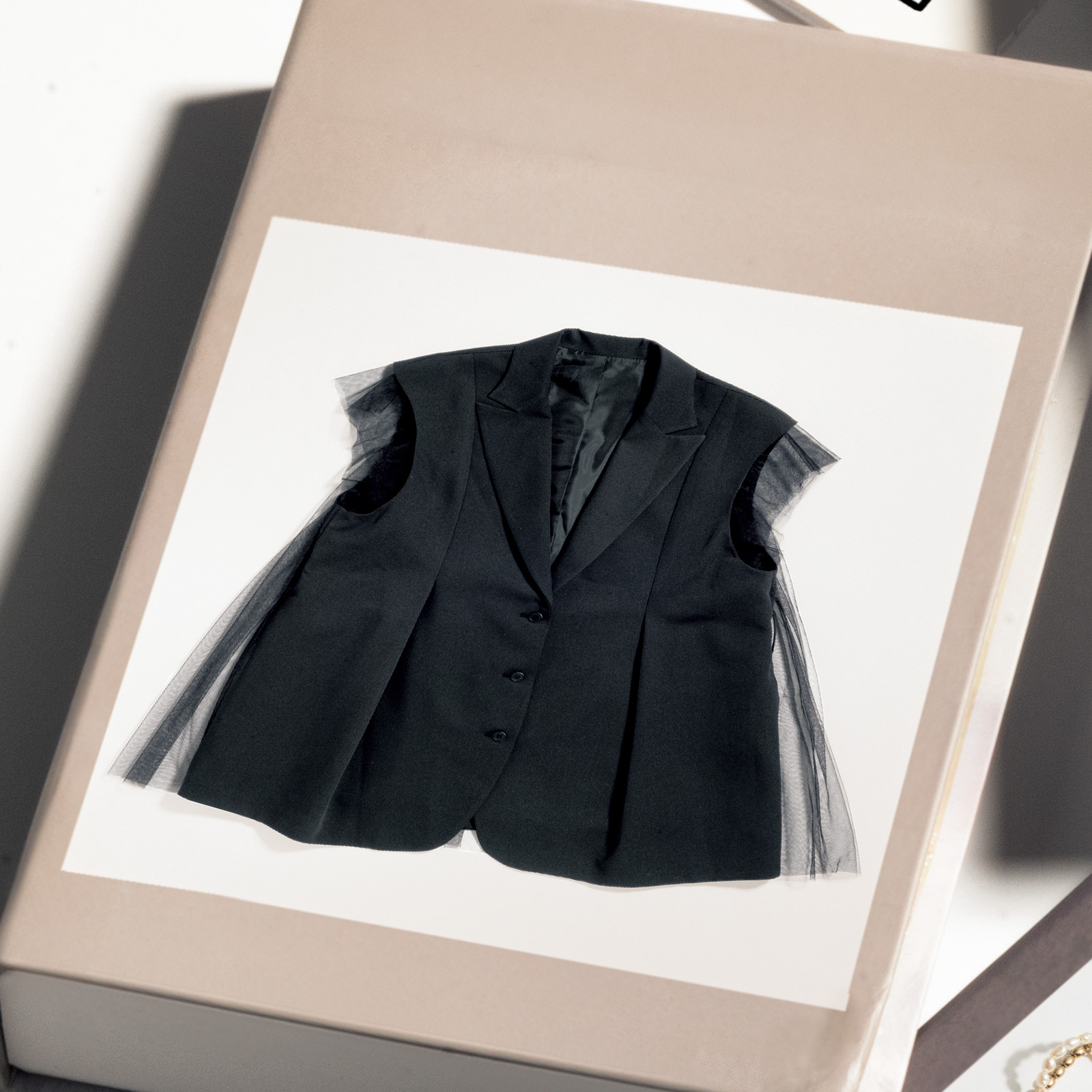 アクセは♡でも変形やシルバーを選ぶと大人っぽくシャープに。ジレはドラマチックなチュール付きで簡単にコーデが完成する名品。