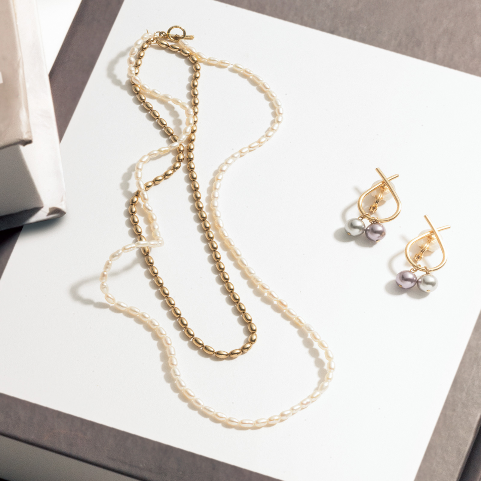 左からネックレス¥20,900(リズリーク/ロードス)パール付きイヤリング¥8,800(イットアトリエ/フォーティーン ショールーム)
