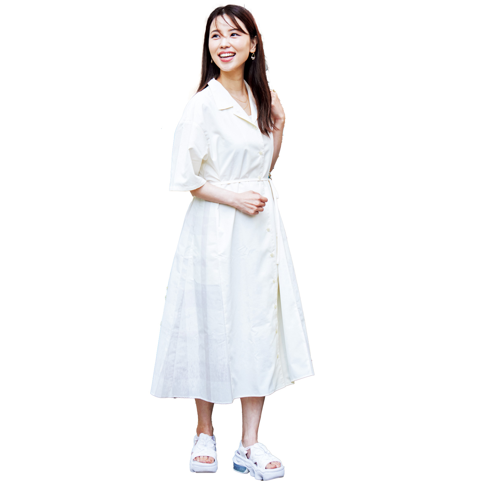 白のシャツワンピにNIKEのスポサンを合わせてカジュアルダウン。山田養蜂場のクッションファンデは程よいツヤで、大人の肌悩みをカバーしてくれるのでお気に入りです。