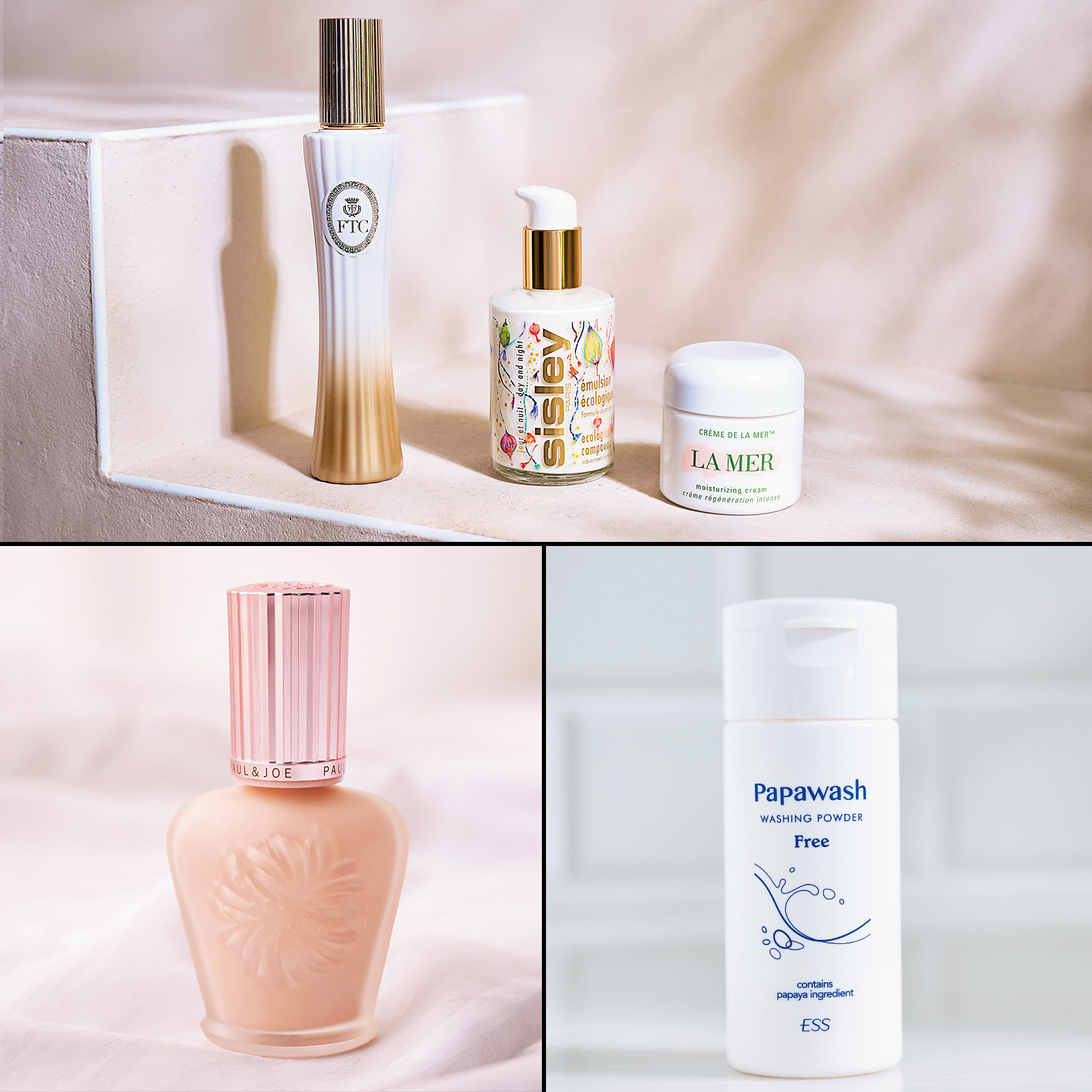 上:左から自社ブランド「FTC」の核となるキー成分、フラーレンを高配合したミストタイプの化粧水。私にとってお薬のような鎮静乳液。シスレーのエコロジカルコムパウンド。20代から愛用のラ・メールのクリーム。