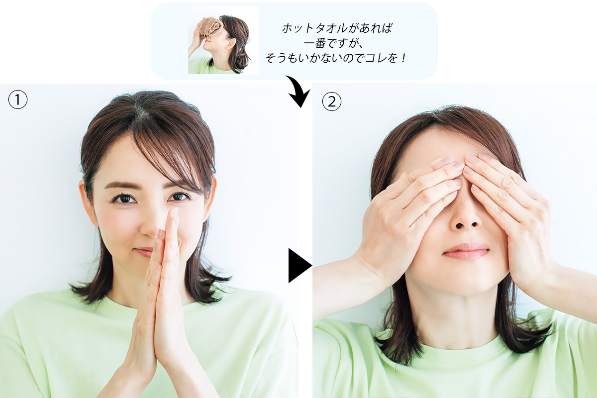 両目を覆う時は眼球を押さえつけないよう注意。目を覆ったら、そのまま目をゆっくり開けたり閉じたりを30秒間繰り返します。メイク崩れもせず、手軽にじんわり癒されます。