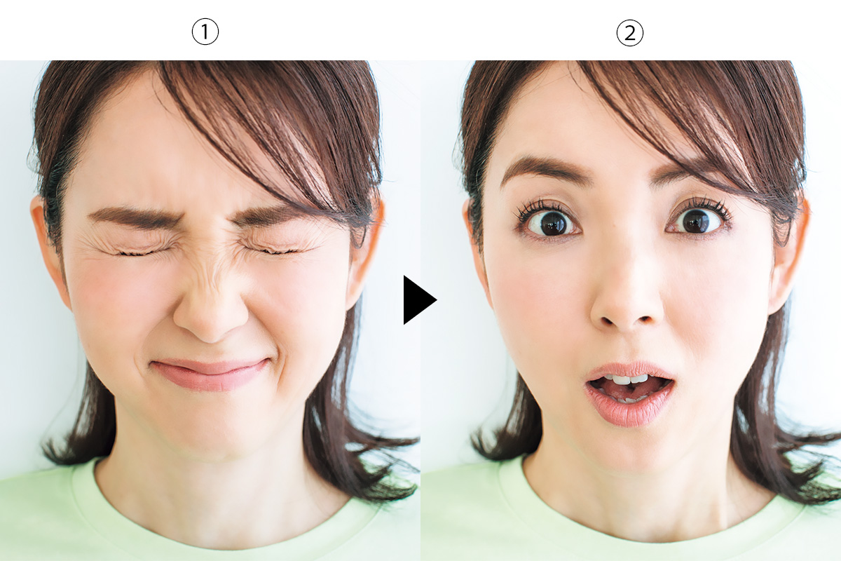 目の周囲を覆う「眼輪筋」のストレッチ。まばたきによって涙の分泌を促し、ドライアイを軽減します。スマホやゲームのやりすぎで目が疲れている時などに3〜5回繰り返して疲れを解消。