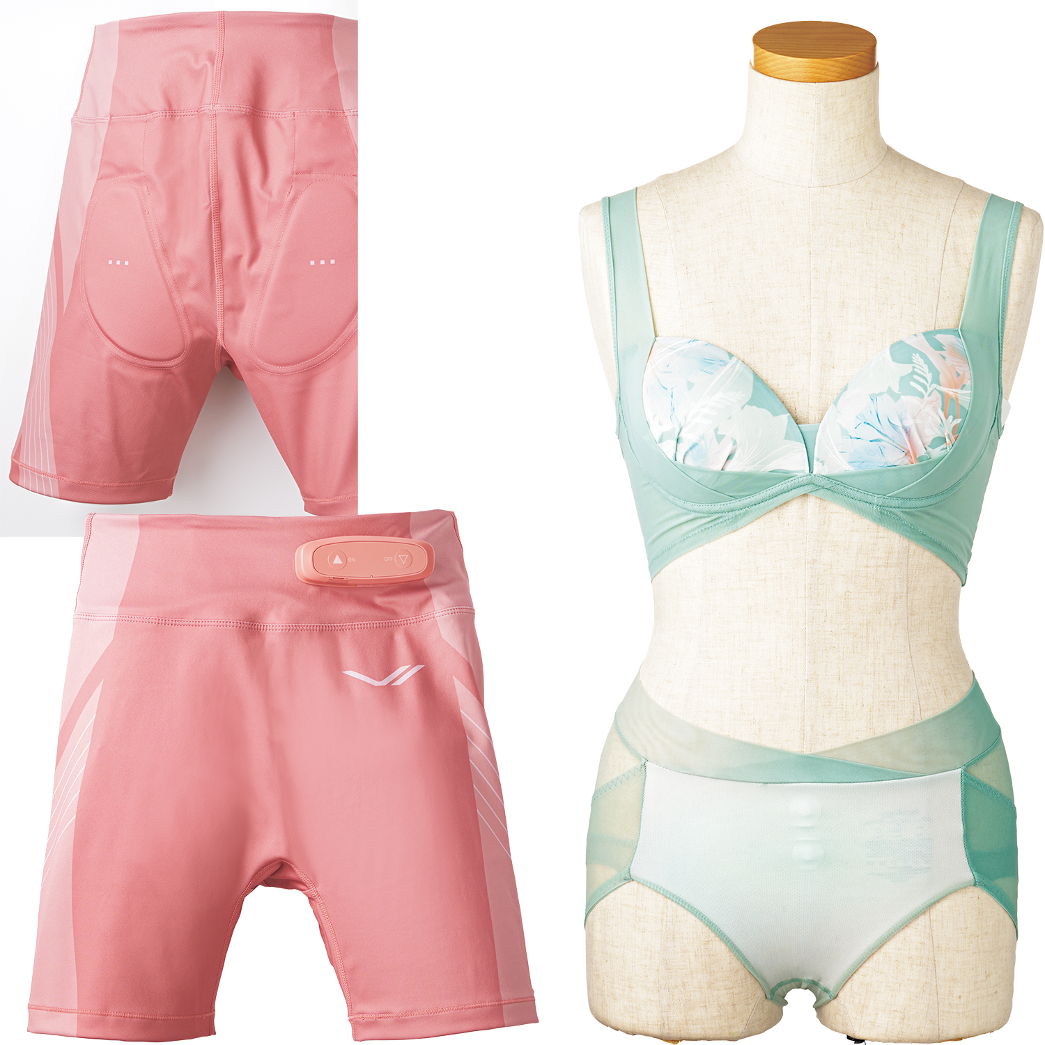 左:筋肉を効率的にトレーニングできる周波数20Hzでながらトレーニングを。ネットで洗濯機利用も可能。SIXPAD Hip Fit ¥39,600(MTG)右:背中とお腹に医療グレードの磁気を仕込んだリカバリー下着。サイズ展開も広くボディポジティブ仕様。リカバリーブラ Air(ブーケセージ)¥7,900・同 ショーツ ¥5,800(healogy)