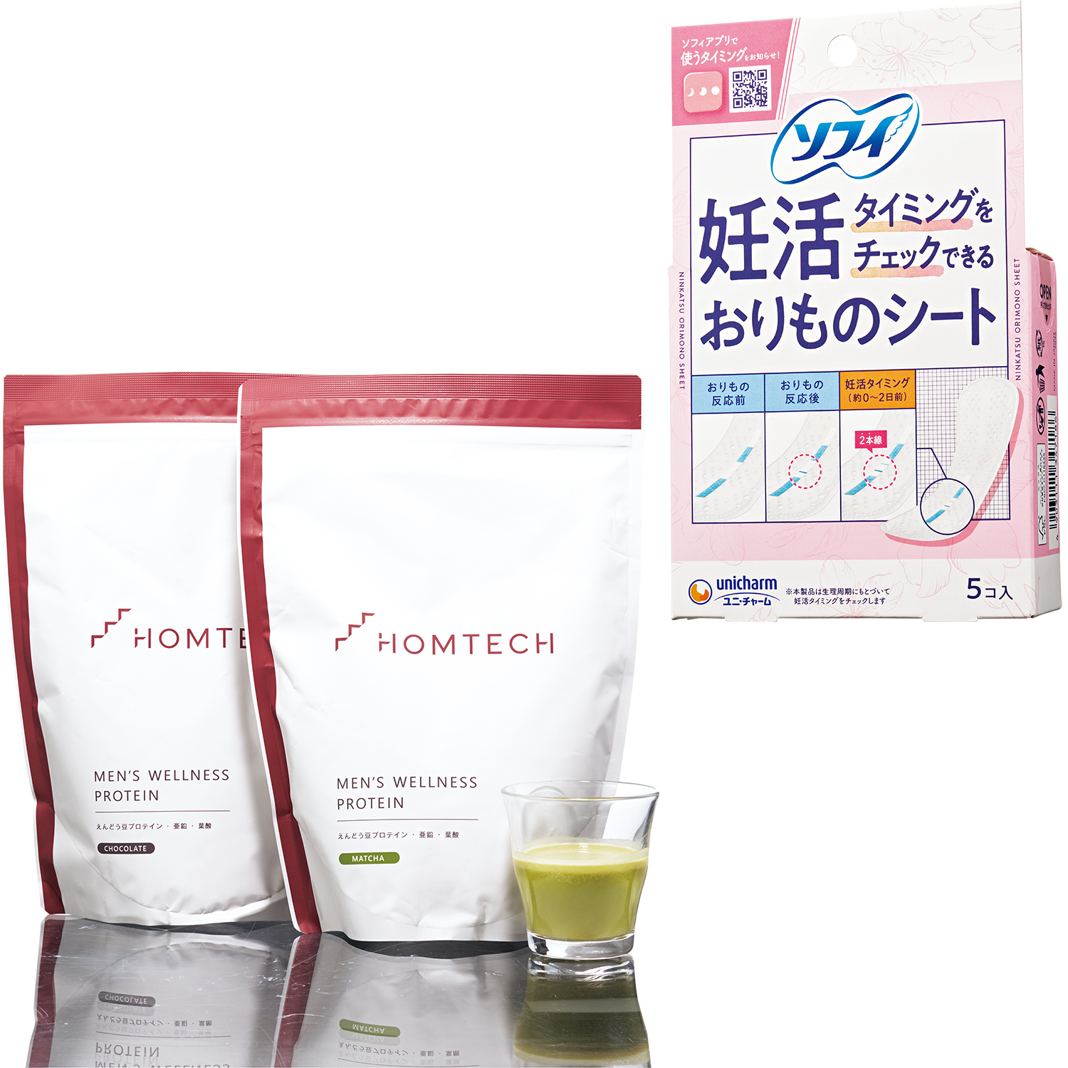 左:独自の開発バイオテスター技術で妊活のタイミングをおりものシー トのラインでお知らせ。ソフィ 妊活タイミングをチェックできるおりものシート5枚 ¥600<編集部調べ>(ユニ・チャーム)右:男性用の妊活に特化したプロテイン。亜鉛や葉酸など男性特有のコンディションに注目した成分を配合。オムテック メンズウェルネス プロテイン 750g(30日分)チョコ味・抹茶味 各¥5,994(アンファー)