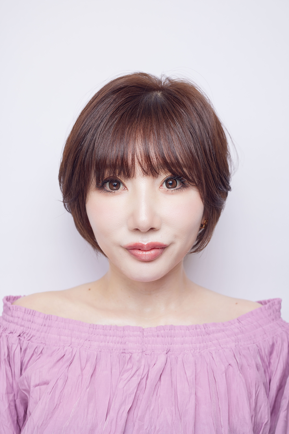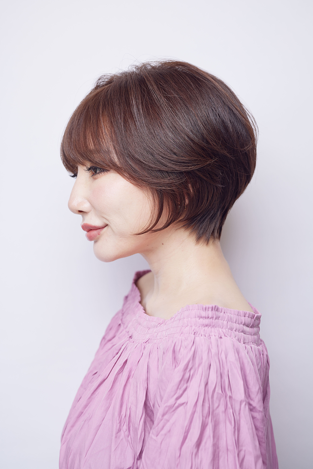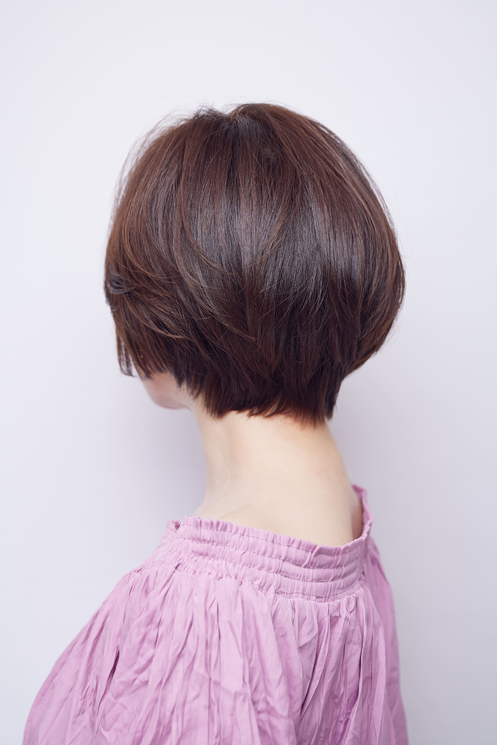 ショートを女性らしく楽しみたいという美スト世代にイチ押しの丸みショート。キレイな面を生かすことでツヤを出し、美髪効果を実感できます。さらに透け感とツヤが共存する秘訣はオリーブブラウンカラー。肌を明るく見せるのにもひと役。