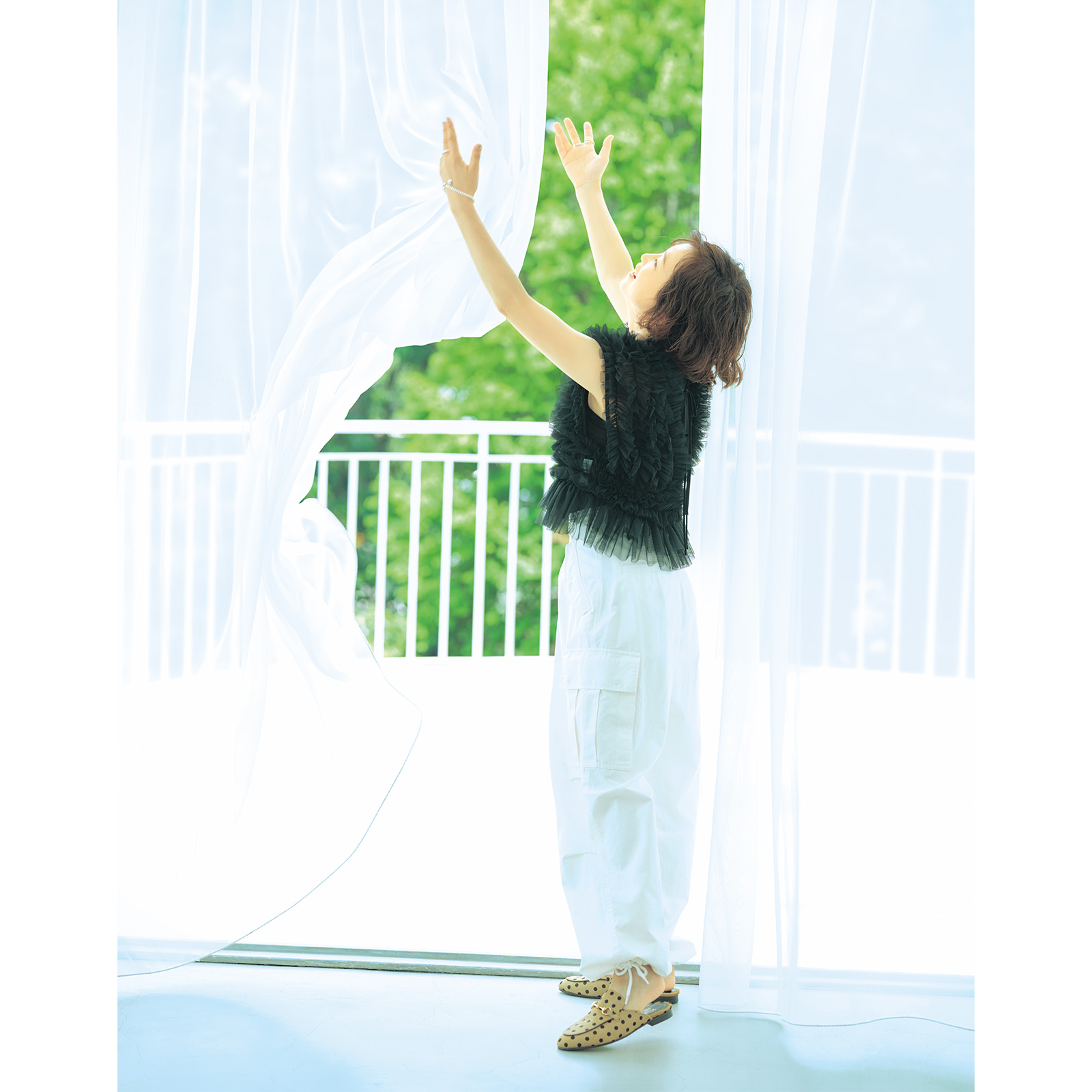 チュールベスト¥17,600(アルページュ ストーリー)パンツ¥15,400(SNIDEL/SNIDEL ルミネ新宿2店)ローファー¥39,600(カステラーノ/フラッパーズ)ピアス¥80,300(ウノアエレ)ネックレス¥64,900(リューク)ブレスレット¥22,000(ウノアエレ シルバーコレクション/ウノアエレ)リング[左手]¥17,200(vihod/ロードス)リング[右手]¥47,300(ミチ ウィルウェイ/フォーティーン ショールーム)タンクトップ(スタイリスト私物)