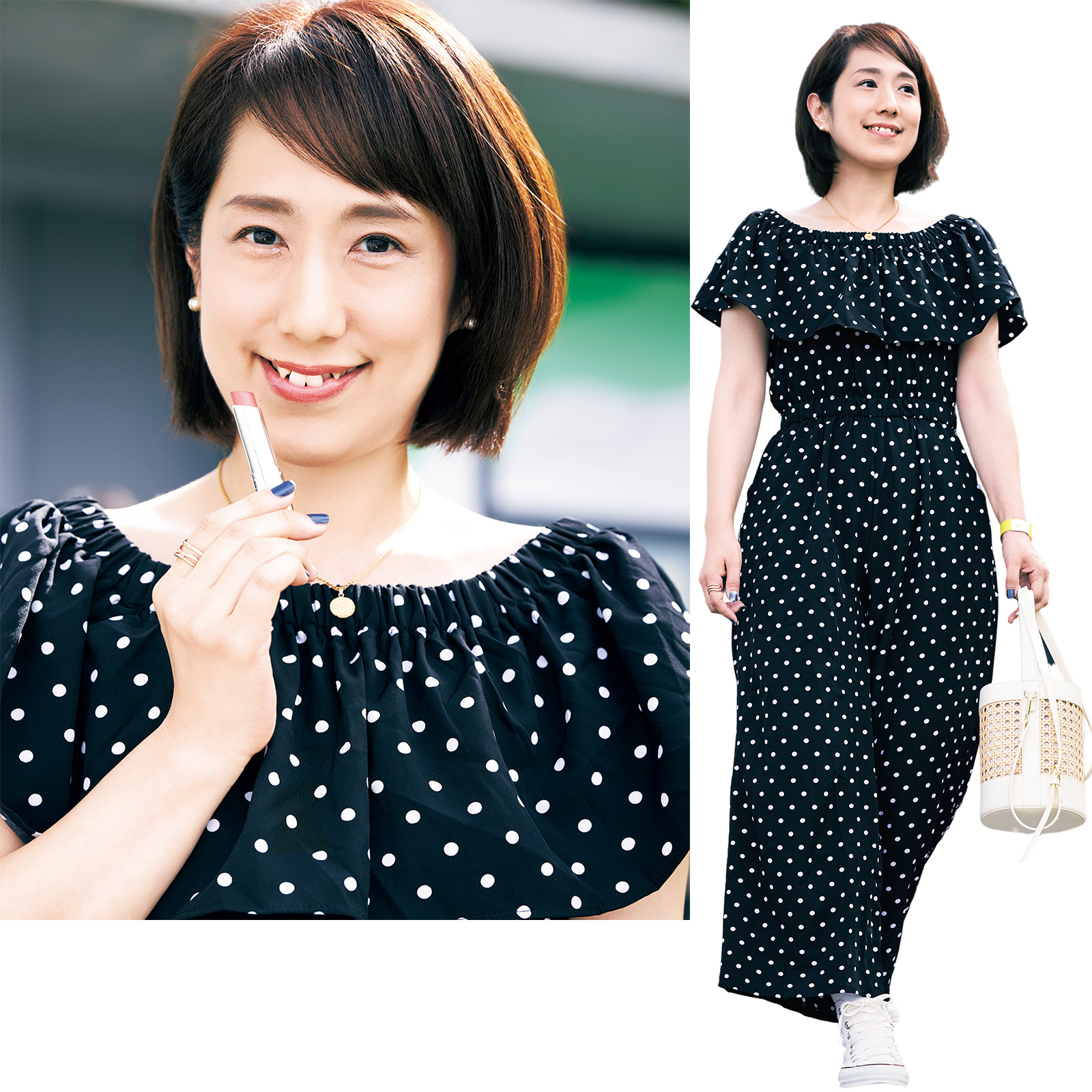 水玉のオールインワンはモノトーンなので、華やか色のリップをアクセントに。Dior リップ012は仕事とプライベートのどちらも使える色なので重宝しています。