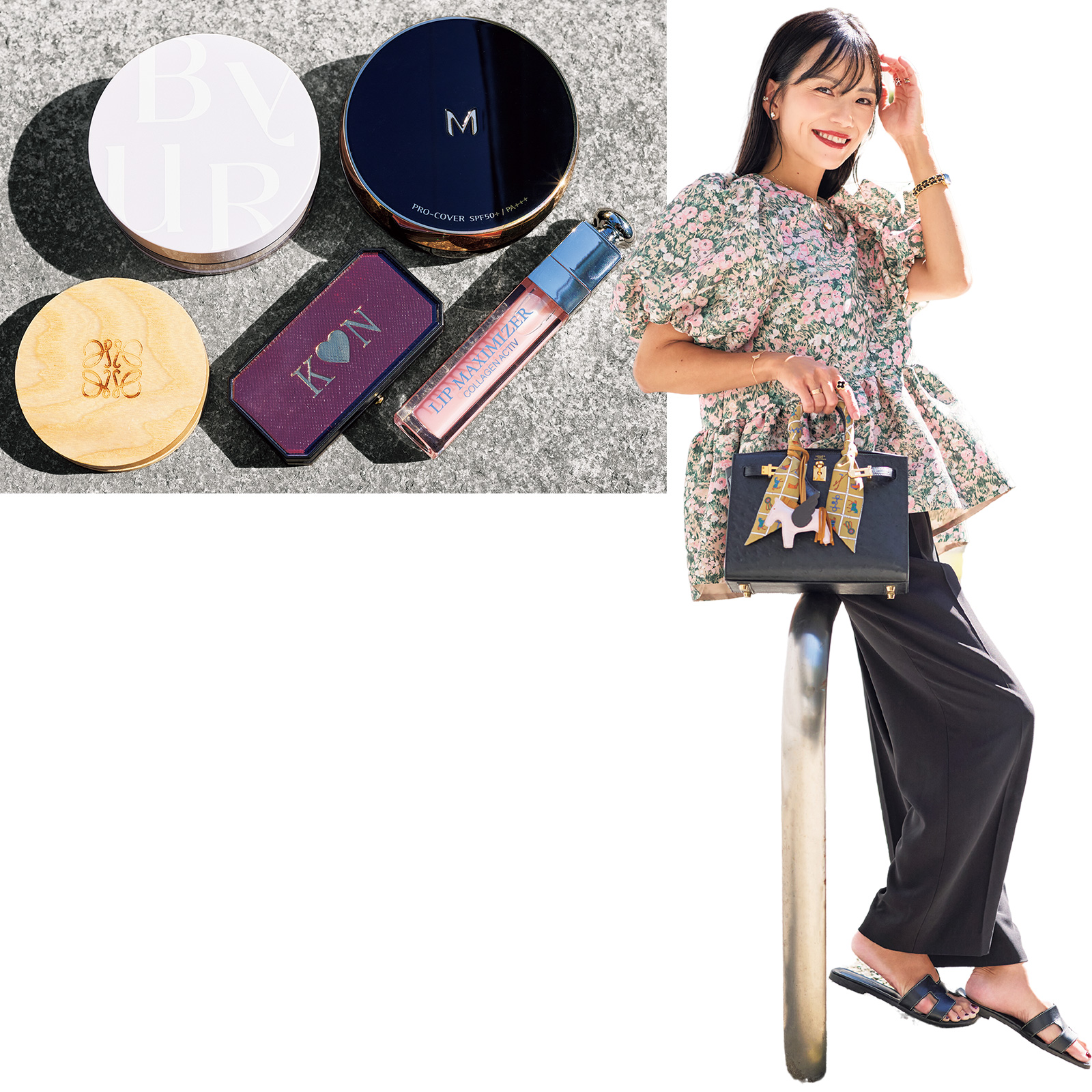 年々唇のタテ線や荒れが気になり、ロエベやビュリーのバーム、とDiorのリップマキシマイザー001は必需品。TSURUの花柄ブラウスとフラットでも映えるエルメスのオランで上品カジュアルに
