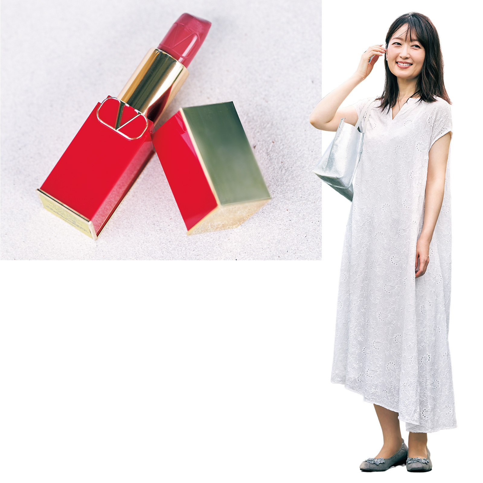 見た目も可愛く持っているとテンションが上がるヴァレンティノのサテン100Rは、血色が盛れて愛用中。ガリャルダガランテで購入した白のカットワークワンピも色っぽさが加わります。