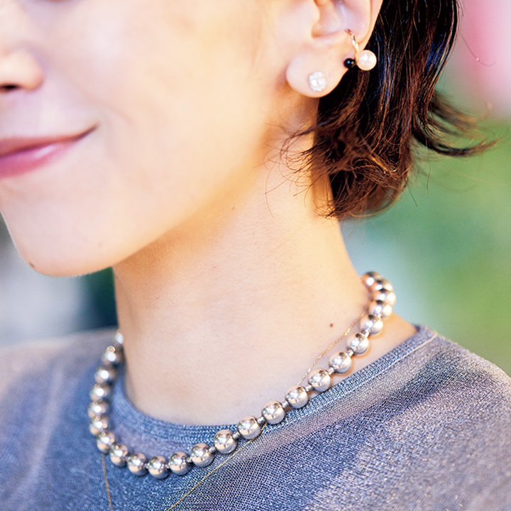 乾かすだけでこなれ感が出るボブ。子育て中でサロンに頻繁に通えないので、伸びてもキレイなのが助かります。ヒロタカのピアスとBONEEのパールネックレスで顔周りが華やかに。