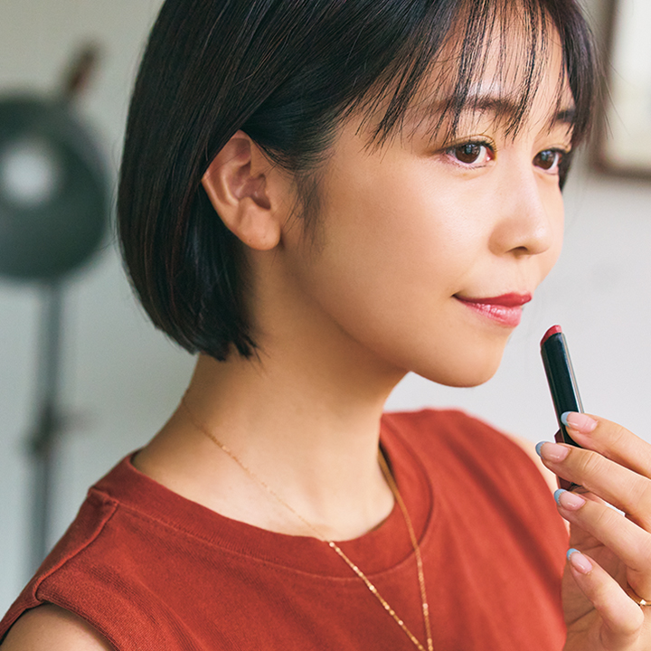 首元をキレイに見せてくれる顎ラインボブに。どの角度から見ても丸みが出るカットで柔らかい印象になれます。唇はトップスの色と合わせたリップモンスター 07番。