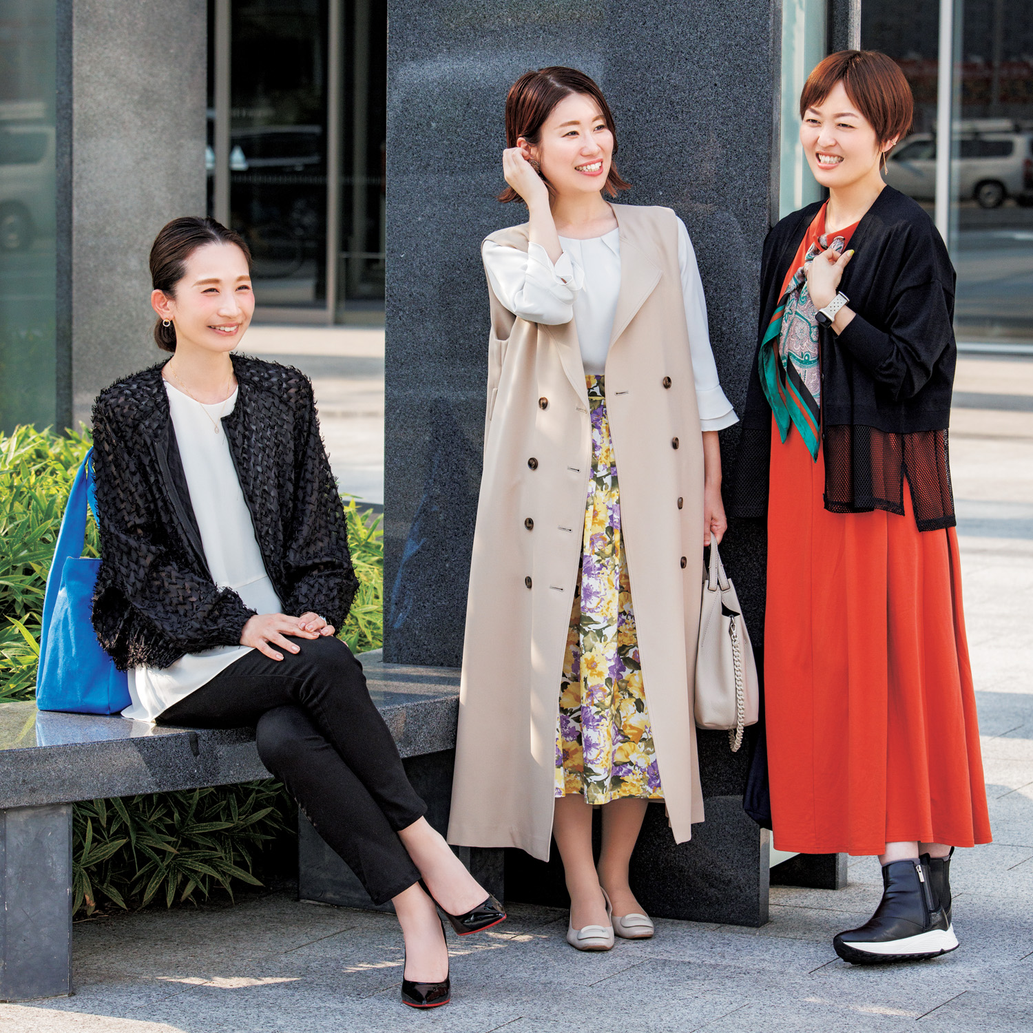 コーデがサマになるZARA のカーデ。(斉藤さん)女子会には大花柄のスカートで明るく。(松田さん)パーソナルカラーがイエベ秋とわかって、コスメも洋服も買物がスムーズに。(中村さん)